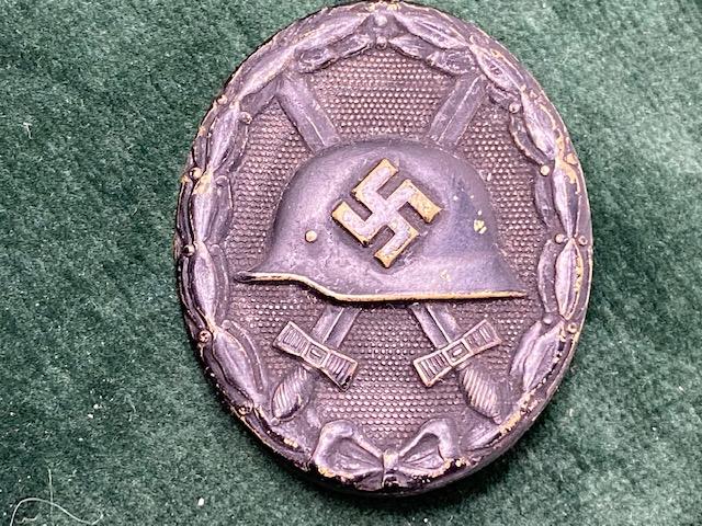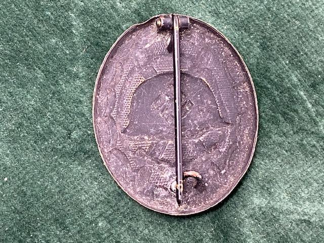 A nice example of the black wound badge, awarded for being injured once or twice. This is pressed hollow back and made of brass. Virtually all of the original black paint is present, with just a little rubbing on the high spots revealing the brass underneath. Pin and hook intact.