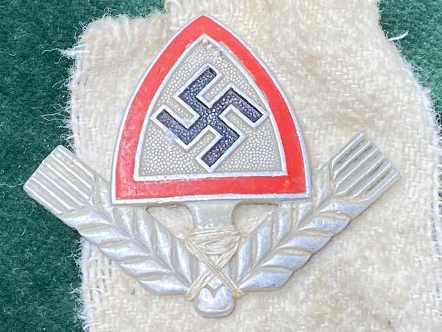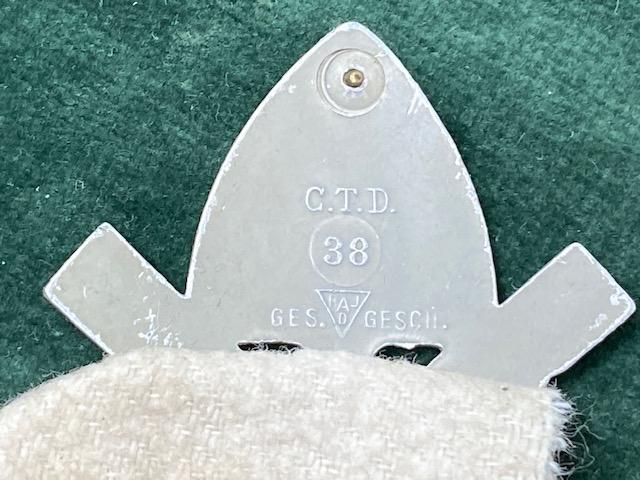 A standard RAD cap badge in pressed aluminium. This was worn on all RAD caps and Kepis and is mostly seen on their brown ‘Robin Hood’ type service cap. With full maker marks, RADJ codes etc on the reverse, it is unfortunately missing its 2 brass pins. Subsequently it is now ideal for a display item with other RAD pieces. It’s been sewn to a piece of white cloth, no idea why!