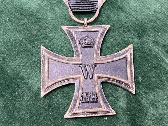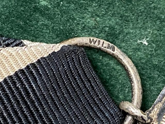 A really nice example of a WW1 Imperial German Iron Cross second class. Toned silver frame with steel centre. All black paint remaining, with very slight corrosion on one arm. Black/white ribbon. Suspension ring is stamped with maker 'WILM'. For H.R. Wilm in Berlin.