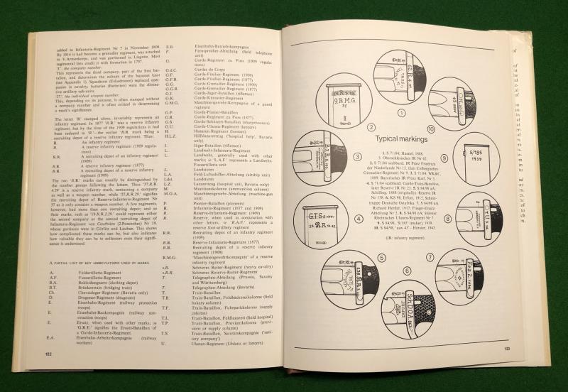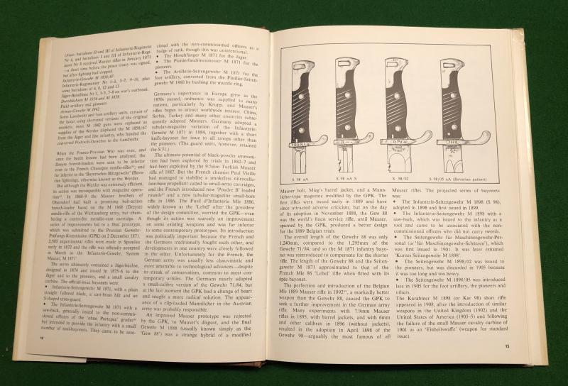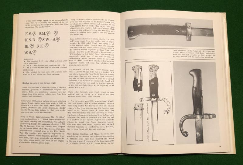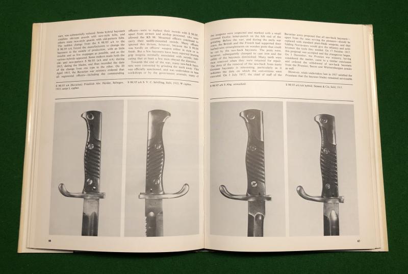 1976 1st ed. ' The German Bayonet A comprehensive illustrated history of the regulation patterns, 1871-1945 ' by John Walter. 128pgs with b/w illustrations, sketches and diagrams. John Walter is a respected authority on all aspects of German weaponry and his ' German Bayonet ' is an authoritative study. Good, used condition with slight creasing to d/w.