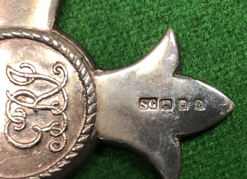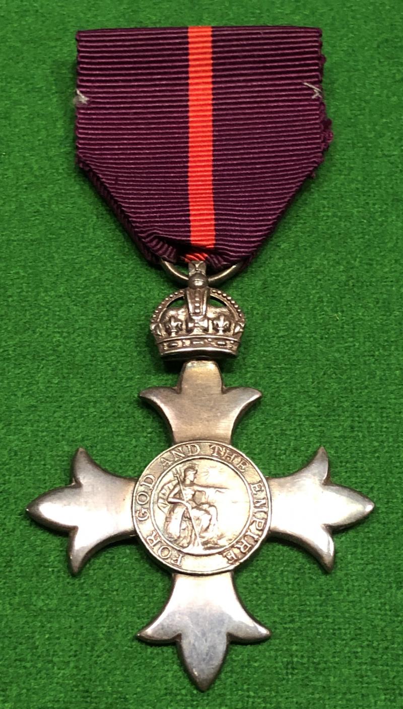 Frosted silver, hallmarked M.B.E. ( Military ), 1st type. London hallmarks for 1919 with original ribbon and mounted for wear. Contained in it's original titled case by Garrard & Co. Good, used condition, toned overall.