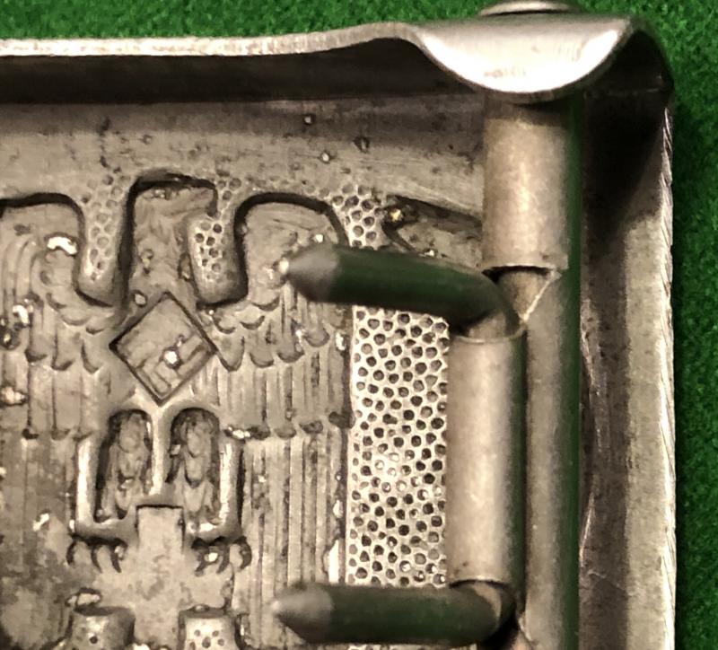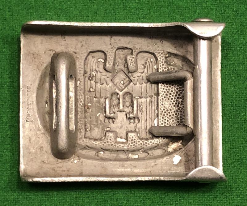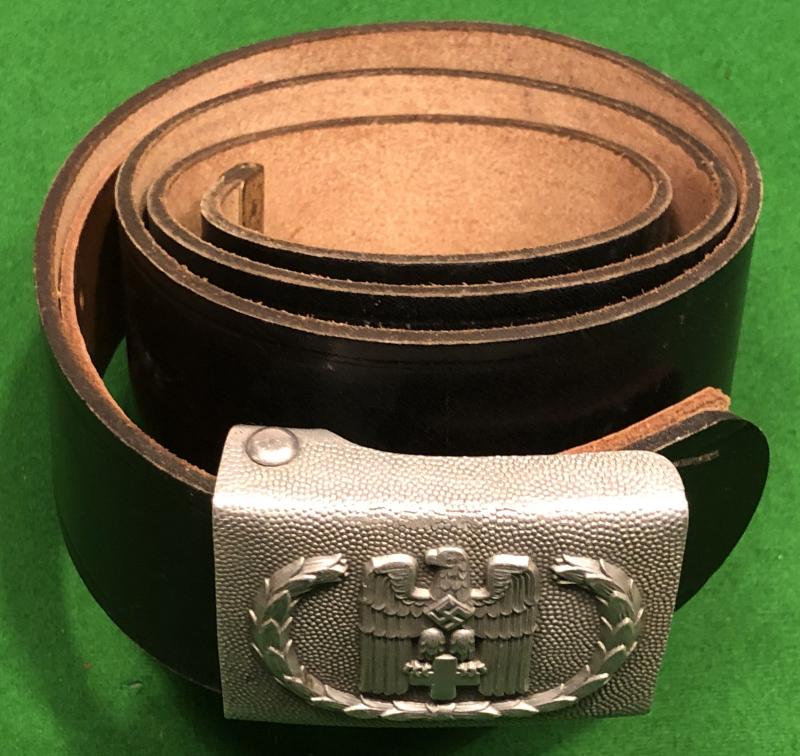 An excellent example of an injection moulded German Red Cross EM/NCO’s Belt Buckle and black leather belt. Buckle marked ' GES. GESCH. 1 ' to reverse. Belt leather has size ' 105 ' pencilled to one end with the tab dated 1944. Light marking and scuffing but otherwise in excellent condition. Buckle toned overall with one very small area of wear to top of buckle.