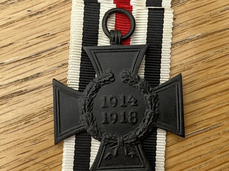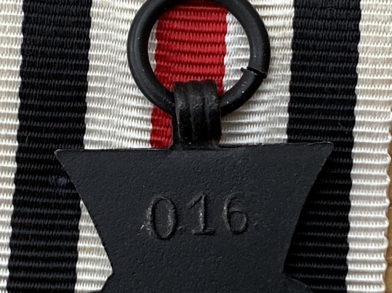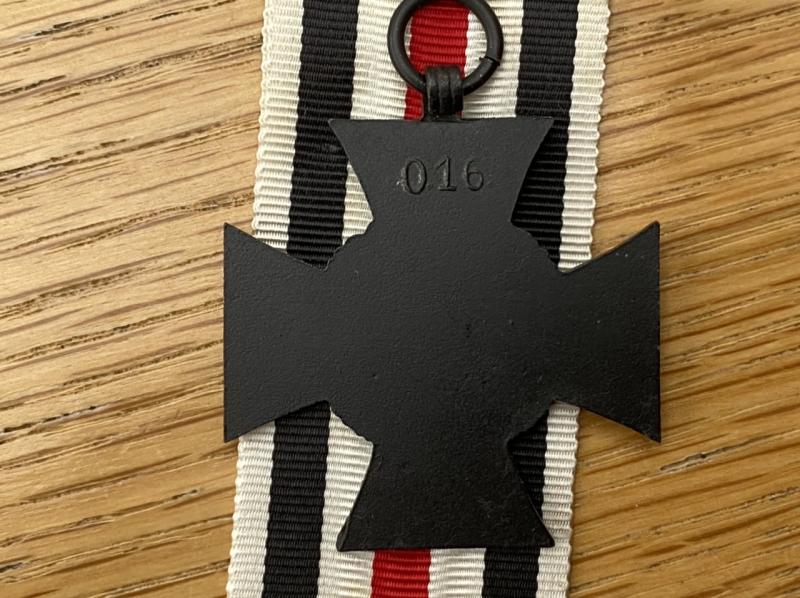 Instituted in July 1934 the cross is steel with anodised black finish. Original length of black/white/red ribbon. Reverse of cross is maker marked. ‘O.16’. The Honour Cross for Next-of-Kin (commonly known as the Widows Cross), was finished in black. The Honour Cross for non-combatants has no swords and a wreath of oak leaves.