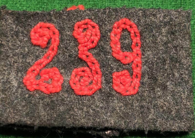 A pair of slip-on unit identity sleeves to go over shoulder straps. Wool with chain stitch ' 239 ' in red indicating 239th Artillery Regiment. Good, clean condition. POSTFREE within UK