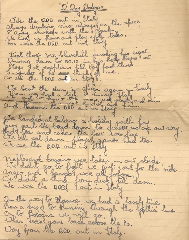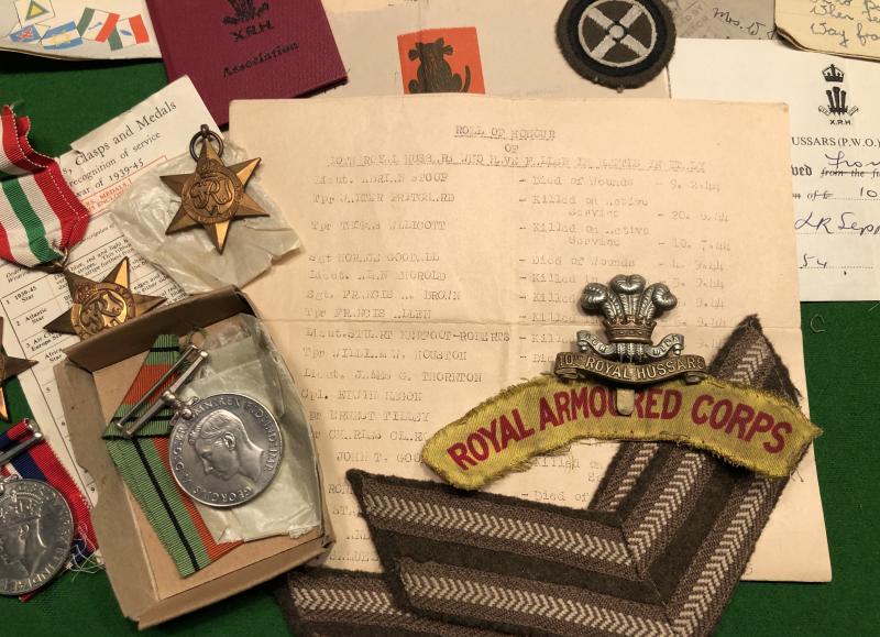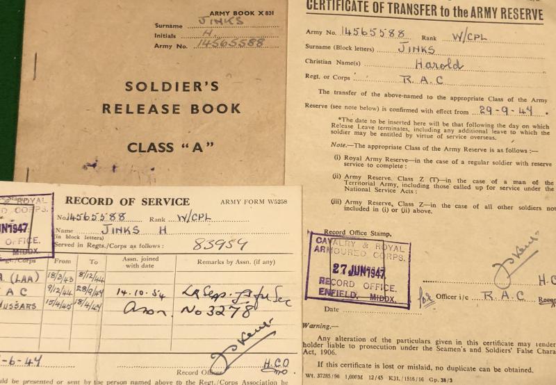 Medal, insignia and paperwork grouping to 14565588 Cpl.Harold Jinks previously LAA, RAC and then 10th Hussars. Group consists of Release book, record of service and certificate of transfer with various items of ephemera including a hand-written copy of all of the verses to the ' D-Day Dodgers ' song, letters etc. Medals - 39-45, Africa, and Italy stars with Defence and War with various packets, entitlement slip and partial box. Various items of cloth insignia, RAC printed shoulder title, Cpl. stripes, driver qualification and 1st Armoured insignia with a 10th Hussars cap badge. Various items of veteran and OCA paperwork.