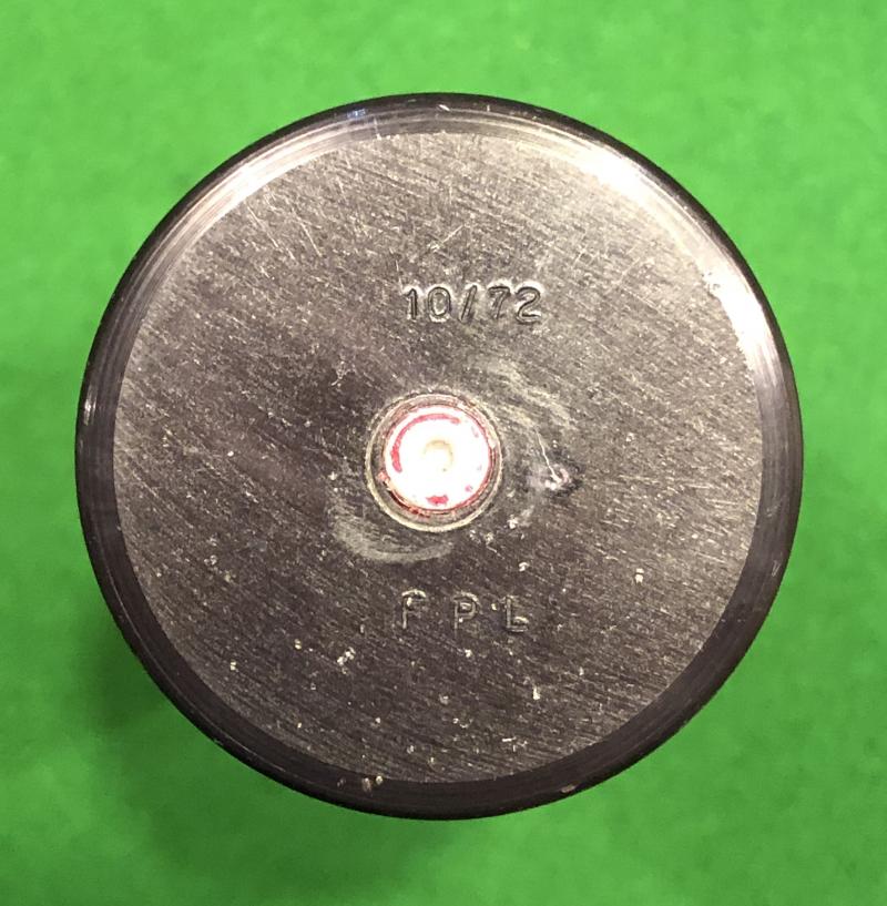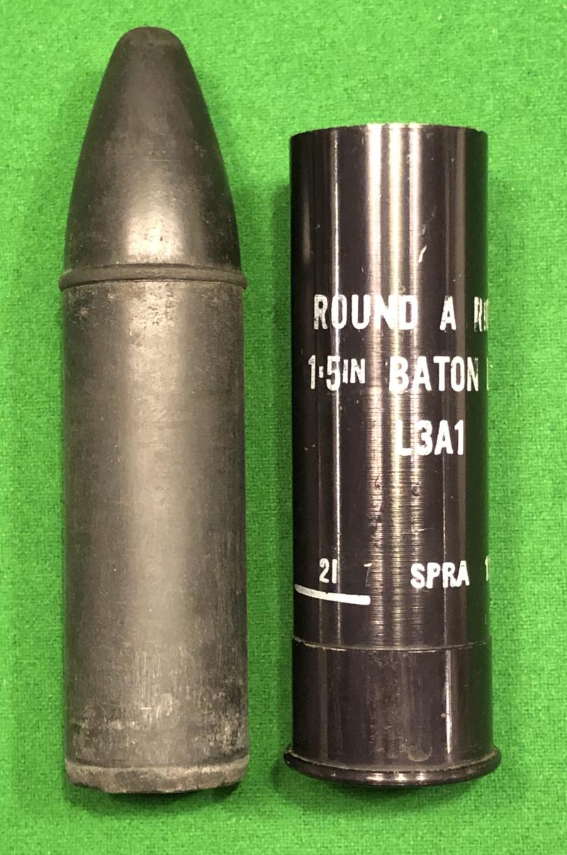 1972 ' Round A/Riot 1.5in.Baton L3A1 ' or plastic bullet. One of the iconic symbols of the Troubles in Northern Ireland where it was widely deployed in what was euphemistically called crowd control. In good condition with clear stencilling to case, SPRA indicating Schermuly Pistol Rocket Apparatus Co.Ltd with case stamped to base FPL for Flowform Plastics Ltd.