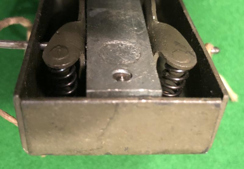 An example of a British WW2 Switch, No.5, Pressure. Designed to be operated when a pressure of 50lbs was applied to either the adjustable extension rod or the top plate of the switch. Often used against railways where the switch could be concealed under the rail and the rod adjusted until contact was made with the underside of the rail. Whilst not as positive as the fog signal igniter in this situation it had the benefit of being concealed in the ballast and thus avoiding detection. Excellent condition.