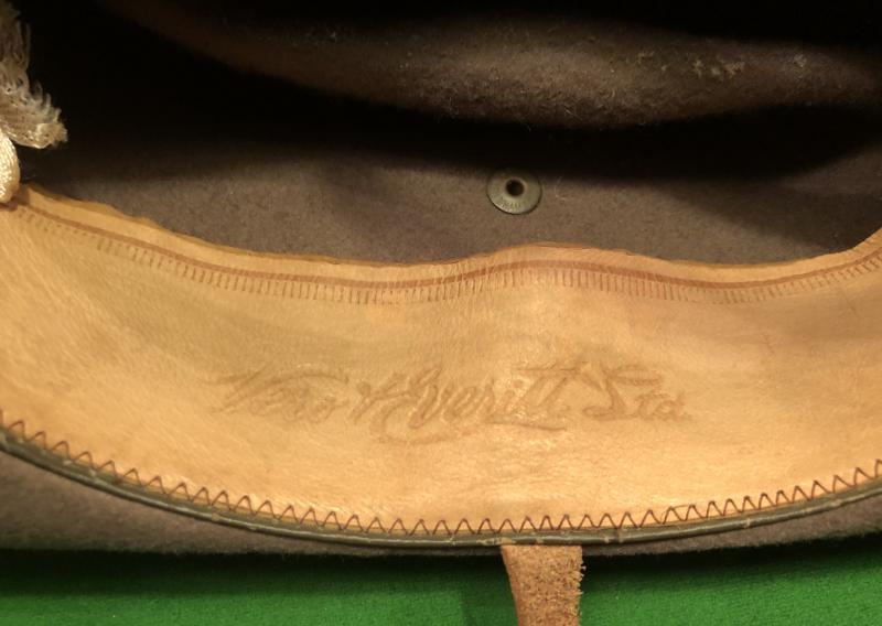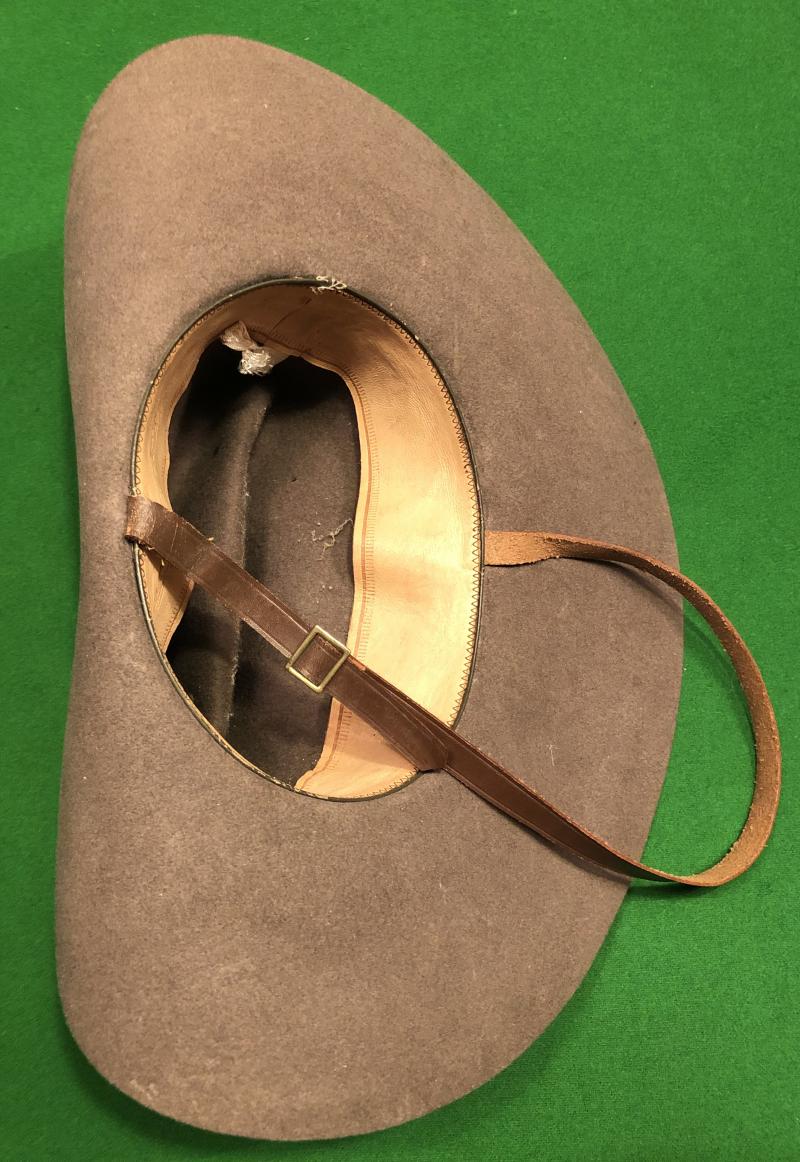 As previously stated it is approx 3/4 size but displays all characteristics of the standard military pattern bush hat with leather, manufacturer marked headband complete with leather chinstrap and ' Newey ' snap fastening. For some reason the central fold has been maintained by the internal application of some brass split pins. In excellent, slightly dusty condition.