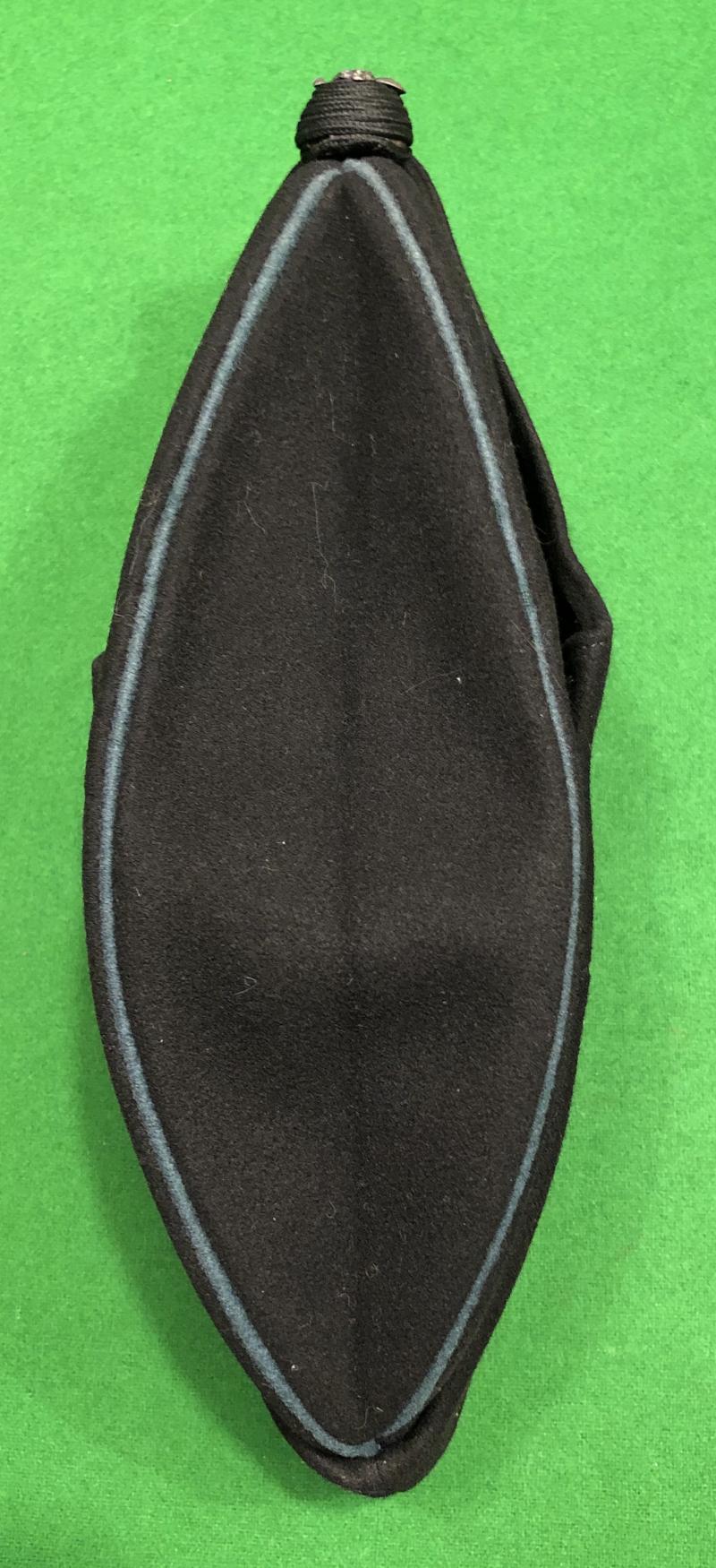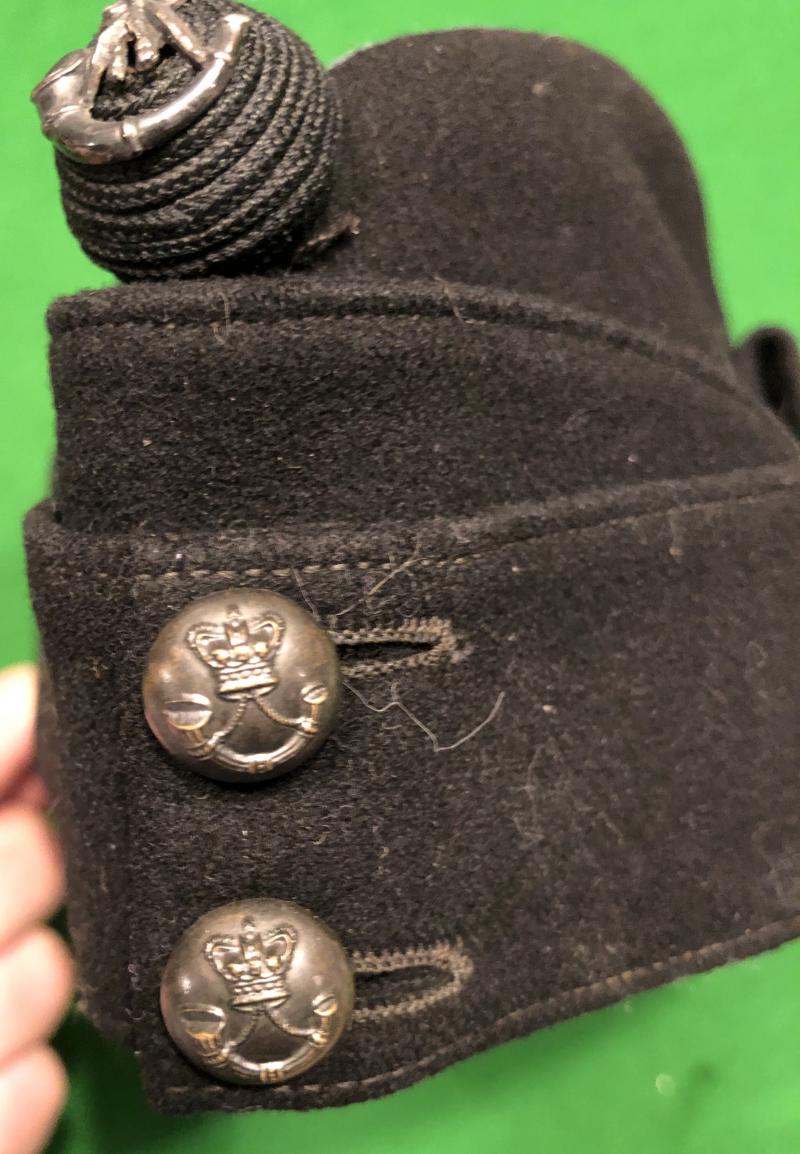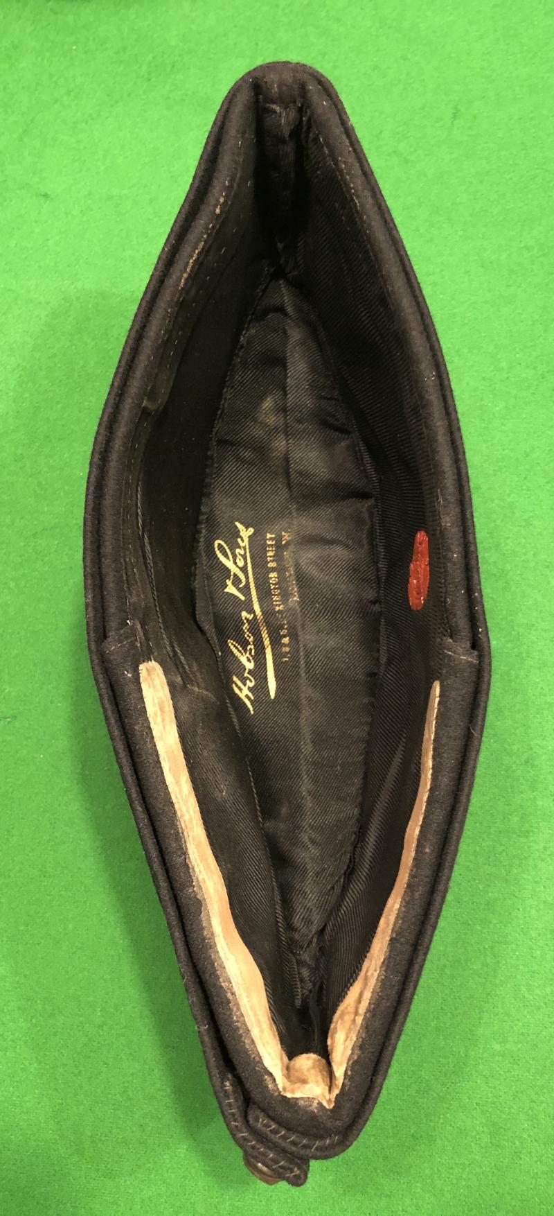 Black, fine wool sidecap by Hobson & Sons for an officer of a rifle regiment. Green cording to crown with silver buttons and surmounted by a corded boss with silver bugle emblem. Cotton lined interior with gold blocked manufacturer's details with the remains of a red wax seal. A half forehead protector made of plush, now heavily worn is present. Silver Victorian crowned buttons now deeply patinated with similar patination to boss emblem. Generally very good condition with some moth tracking to one side.