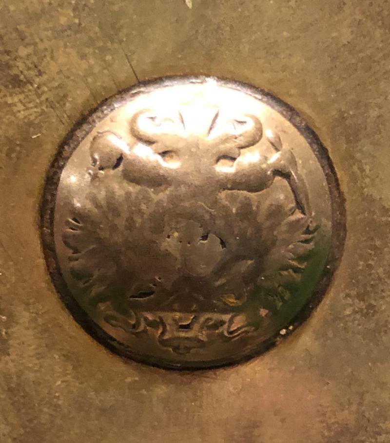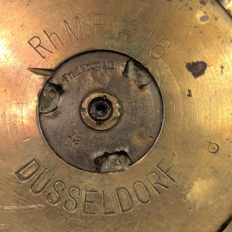 Imperial brass Trench Art ashtray and matchbox holder. Base is made from a 1916 dated 77mm cartridge case with an inverted bottle necked rifle case forming a stem for the folded brass matchbox holder with a brass, Austrian, double-headed eagle button soldered to the outside. Good condition with some failing to solder to one side.