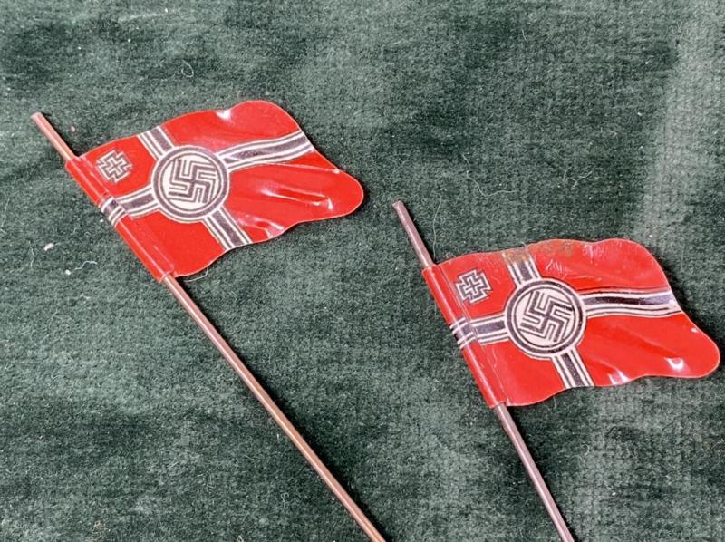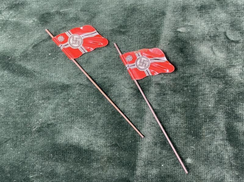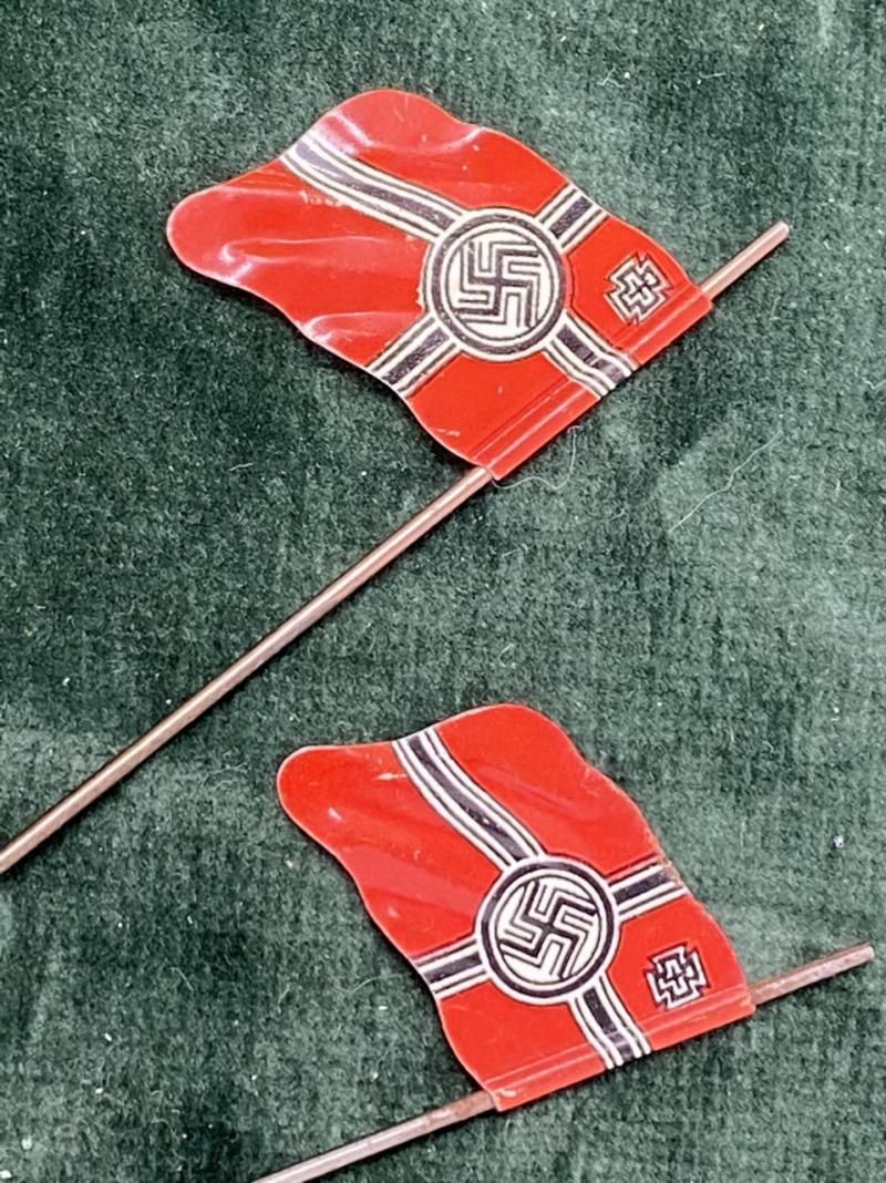 Part of the set of toy ‘soldiers’ produced by the Linoel or Elastolin company in the 1930’s. Carried by a standard bearer figure. Small double sided painted metal flag with small metal pole. About 2” overall height. In mint condition. Great little display items to go with a collection, or add to your missing toy figure! (I have 2 of these only)