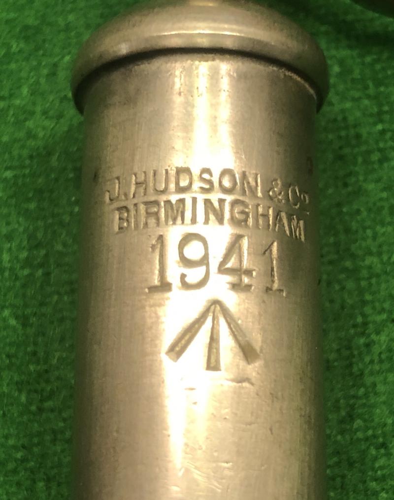 1941 dated nickel whistle by J.Hudson & Co. Birmingham and clip to lanyard ring. Good, overall condition.