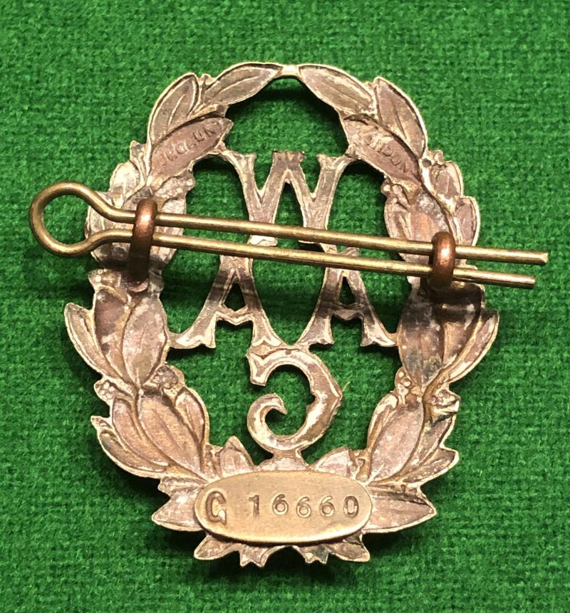 Die-struck brass badge for wear by a member of the W.A.A.C. - Women's Army Auxiliary Corps. Maker marked ' J.R.Gaunt, London ' with separate plaque with individual number. Both lugs intact with pin.