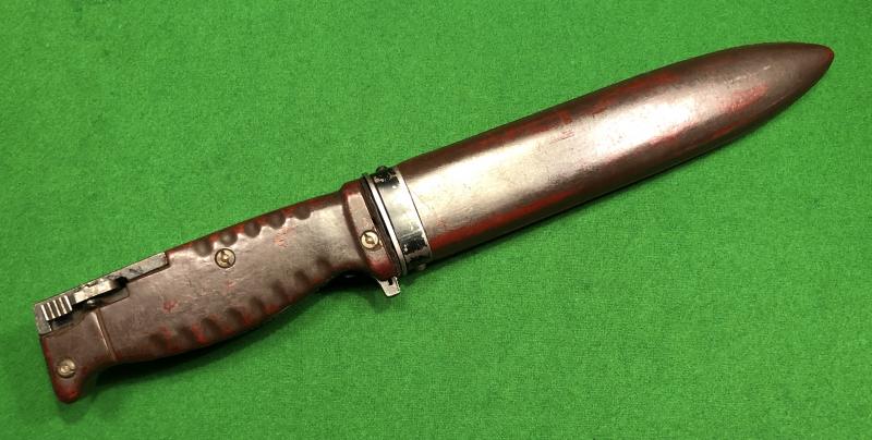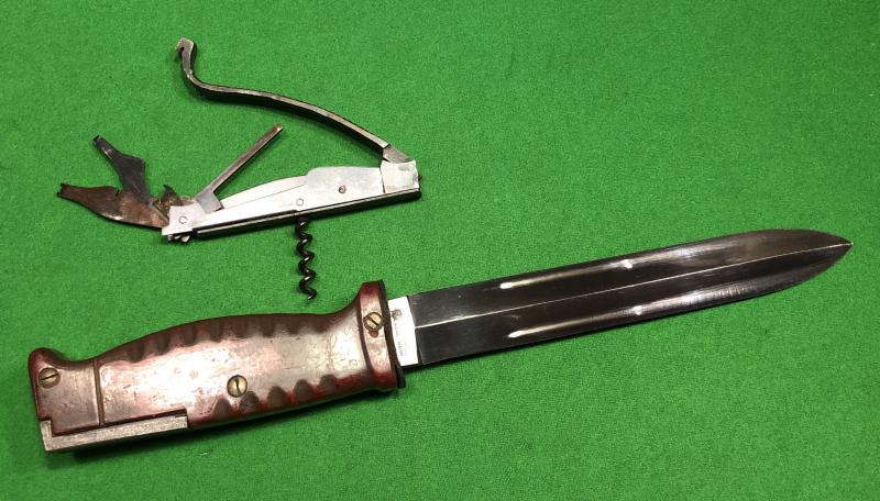 A scarce example of the AR10 bayonet by Interarmco with multi-tool contained in the handle. Based on the WW2 German SG42 bayonet, the design was resurrected and manufactured by Eickhorn for use on the new AR10 automatic rifle designed by Stoner. It is believed that only 4000 were manufactured and were retailed by the US Interarmco company and mostly supplied to contracts in Burma and Sudan.