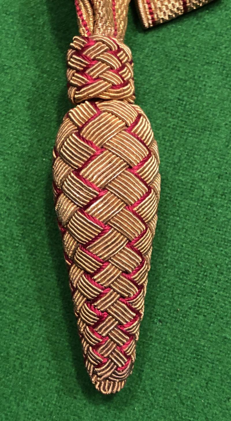Original, period British Infantry dress sword knot. Crimson and gold, bullion ribbon and woven gold cone knot. Clear signs of previously being tied with light marking and overall patination.
