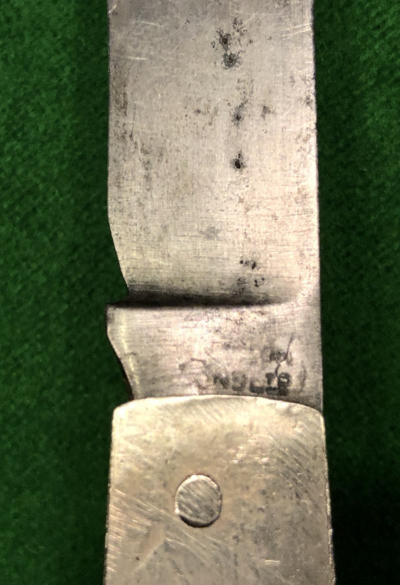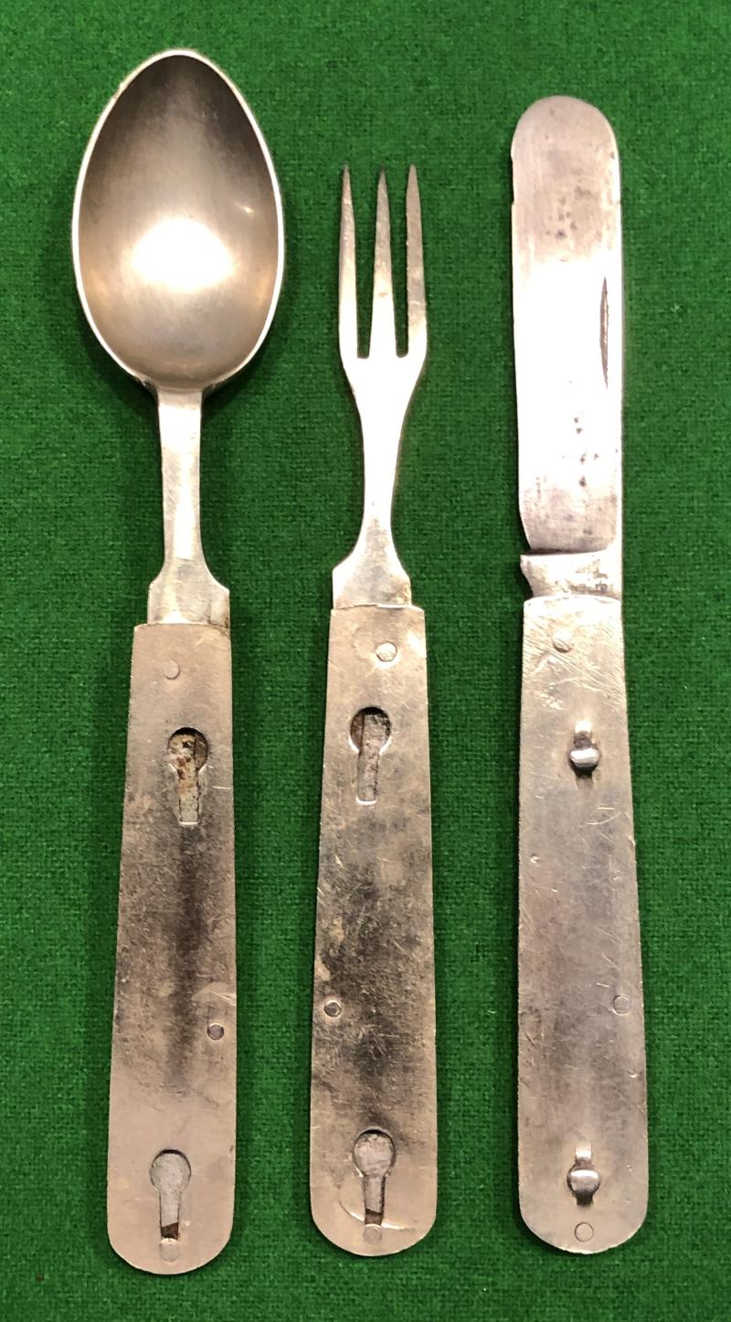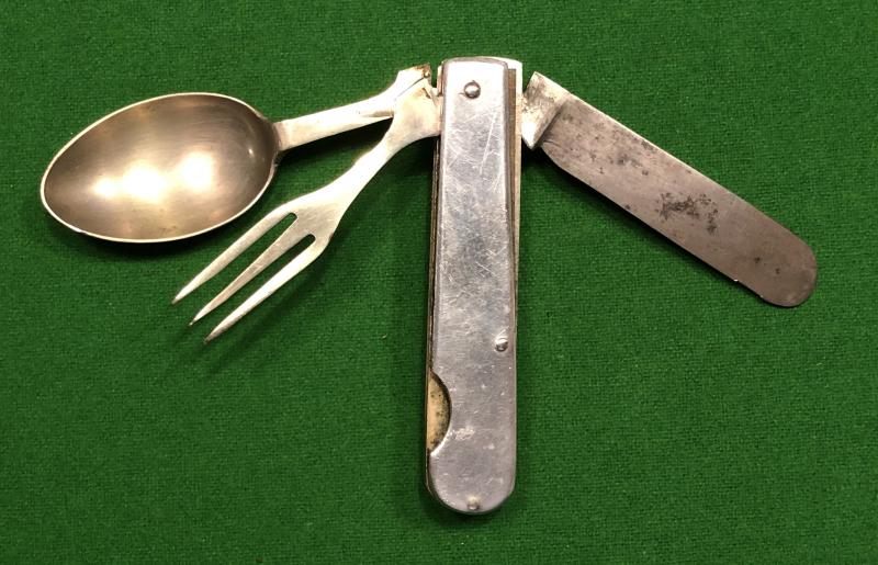 Nickelled Spoon, fork and steel folding cutlery set carried by British officers during WW1. Probably made by Moulton & Sons, Sheffield with partial marking to the knife this example has aluminium bolsters and is contained in the original waterproofed canvas, drawstring bag. Good, used condition with some wear to bag.
