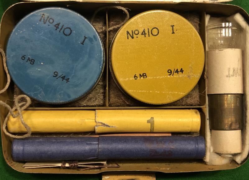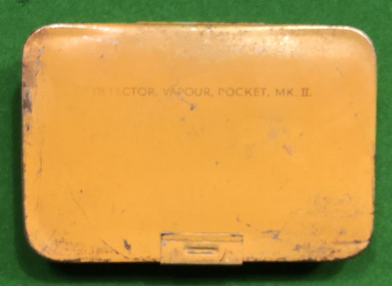 Detector, Vapour, Pocket, MkII and air sampling pump. 1944 dated tin containing 1943 dated papers and reagents required for the testing for the presence of Mustard Gas and other Blister Gases. Complete with 1943 dated notebook. Contents in mint unissued condition with very light corrosion and rubbing to exterior.