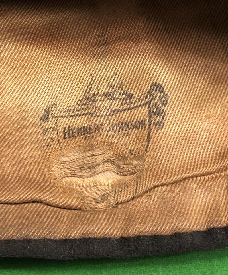 Fine wool, two colour torn style cap for an officer of the Northumberland Fusiliers. Manufactured by Herbert Johnson and featuring a bullion grenade with silver St.George device to front. Silk lining with manufacturer's logo to interior which has staining, damage and marking from wear. Good, overall condition with some wear to nap of cloth and patination of bullion, no moth damage.