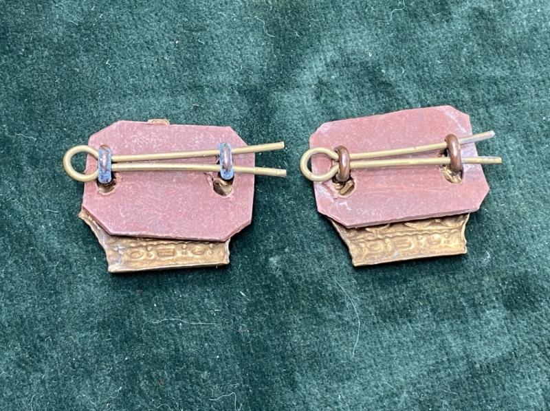 Complete with pins and backing. A pair of WW2 lower sleeve Warrant Officers rank crowns. All brass with period fibre backing plates.