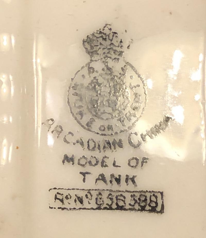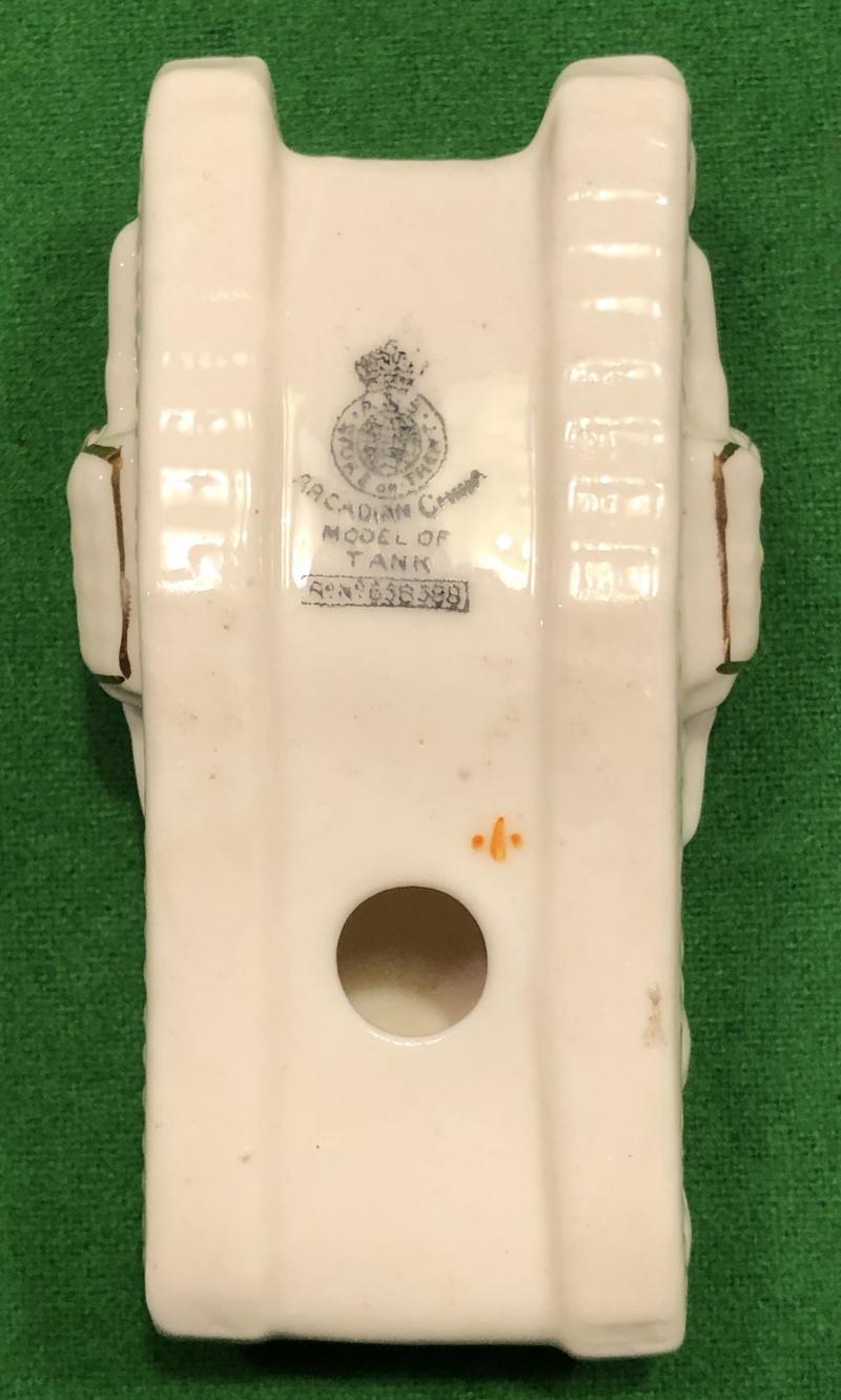 China model tank by Arcadian China, Stoke on Trent. Registered design featuring a MkIV male tank . 120mm in length, featuring the crest of Ramsgate. Popular souvenir of the period in good undamaged condition with light rubbing to gilding.