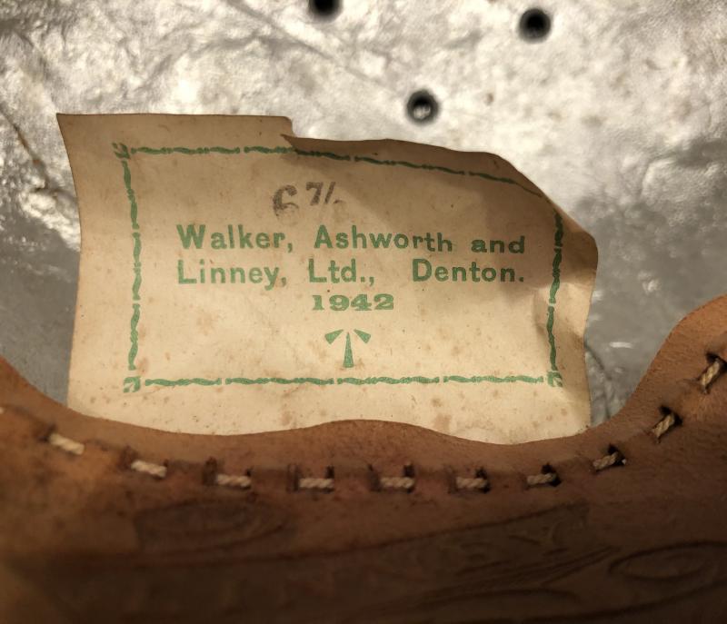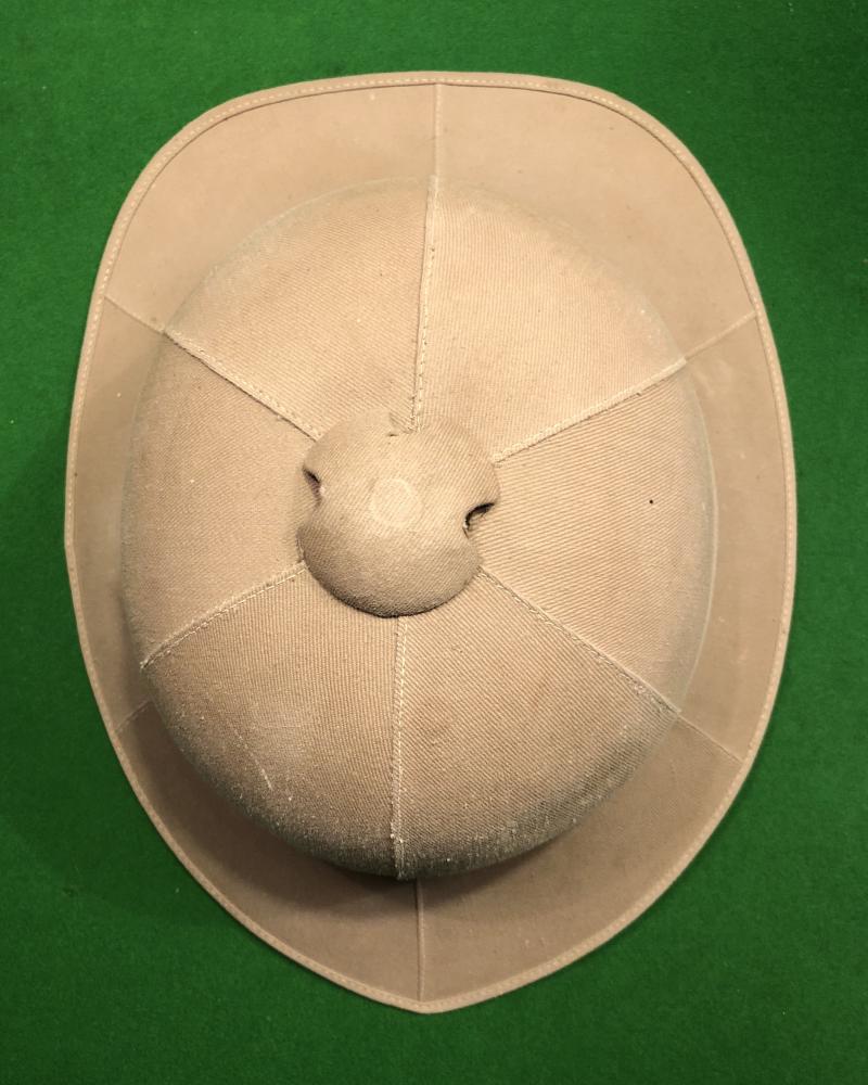 A good, probably unissued, British tropical helmet. Khaki cloth with a single fold puggaree, green baize lining with a foil protector to crown. Size 6 7/8 manufactured by Walker, Ashworth and Linney Ltd., Denton in 1942 with paper label attached to leather liner. Good, clean condition.