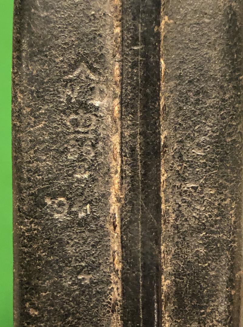 Victorian, Lee Metford, 1888 Mark I Type 2 bayonet manufactured for the British .303 calibre Enfield, Lee Metford rifle. Clearly marked with Victorian crown and ' 6 and 93 ' indicating manufacture in June 1893 with a broad arrow and ' WD ' with various inspection marks to blade and grip. Also marked ' 511 ' to body with matching number to scabbard throat. The bayonet is contained in a standard 1888 MK I pattern scabbard with inspection marks to leather and steel parts. Good, used condition with some staining but no corrosion.