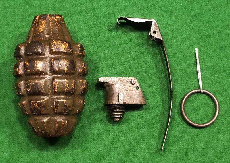 The definitive U.S. grenade, the Mk.2A1 Fragmentation grenade was introduced in 1944 being used through to the end of the War, Korea and to the early part of the Vietnam conflict.This has an early body that has originally been yellow painted and subsequently been overpainted olive drab Fitted with what appears to be a M10A3 igniter set used with grenades having fillers that do not require a detonator. Body marked with manufacturer's casting marks. This example is in good condition with 85% original paint with some corrosion to igniter set.