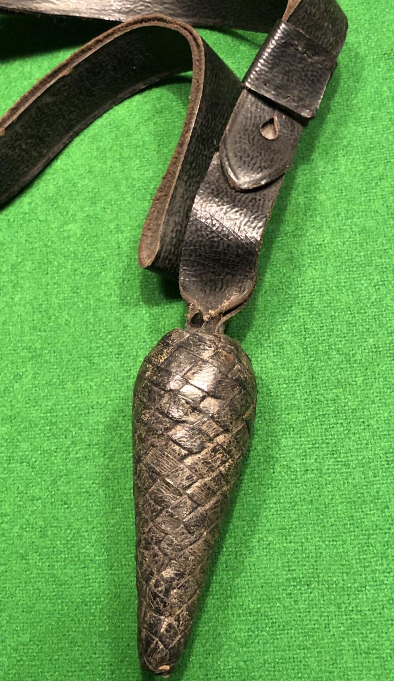British sword knot, blackened leather straps and cone for use by rifle regiments. Good, used condition.
