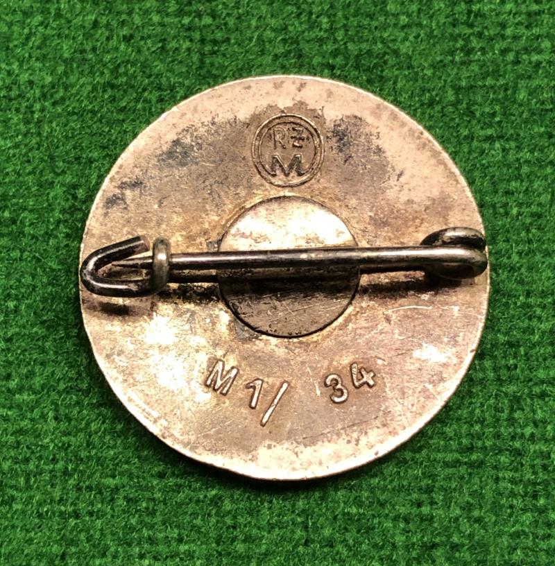 Enamel and silvered brass NSDAP Party Badge. RZM m1/34( Karl Wurster, Markneukirchen) marked to reverse with pin type fitting. Patinated to the reverse with similar patination to the obverse, with two flakes of enamel damage at 5 and 10 O'clock. Priced to accommodate this.