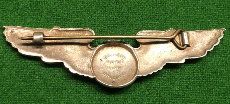 USAAF Aircrew Wing by Wallace Bishop of Brisbane, Australia. Full size 3"/7cm die-struck sterling silver aircrew wing. Pin backed. Manufacturer and ' Silver ' marked to reverse. An uncommon example in excellent used condition.
