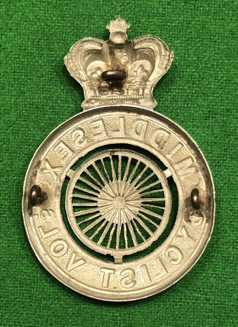 Die stamped white metal glengarry badge for the 26th (Cyclists) Middlesex Rifle Volunteers 1888-1901. Good, clean condition, all loops intact and scarce.