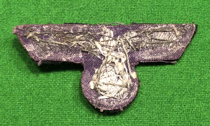 Silver bullion cap eagle for use by officers/officials of the Kriegsmarine administrative branch. Good, used condition with evidence of moth damage to backing to one side of swastika.
