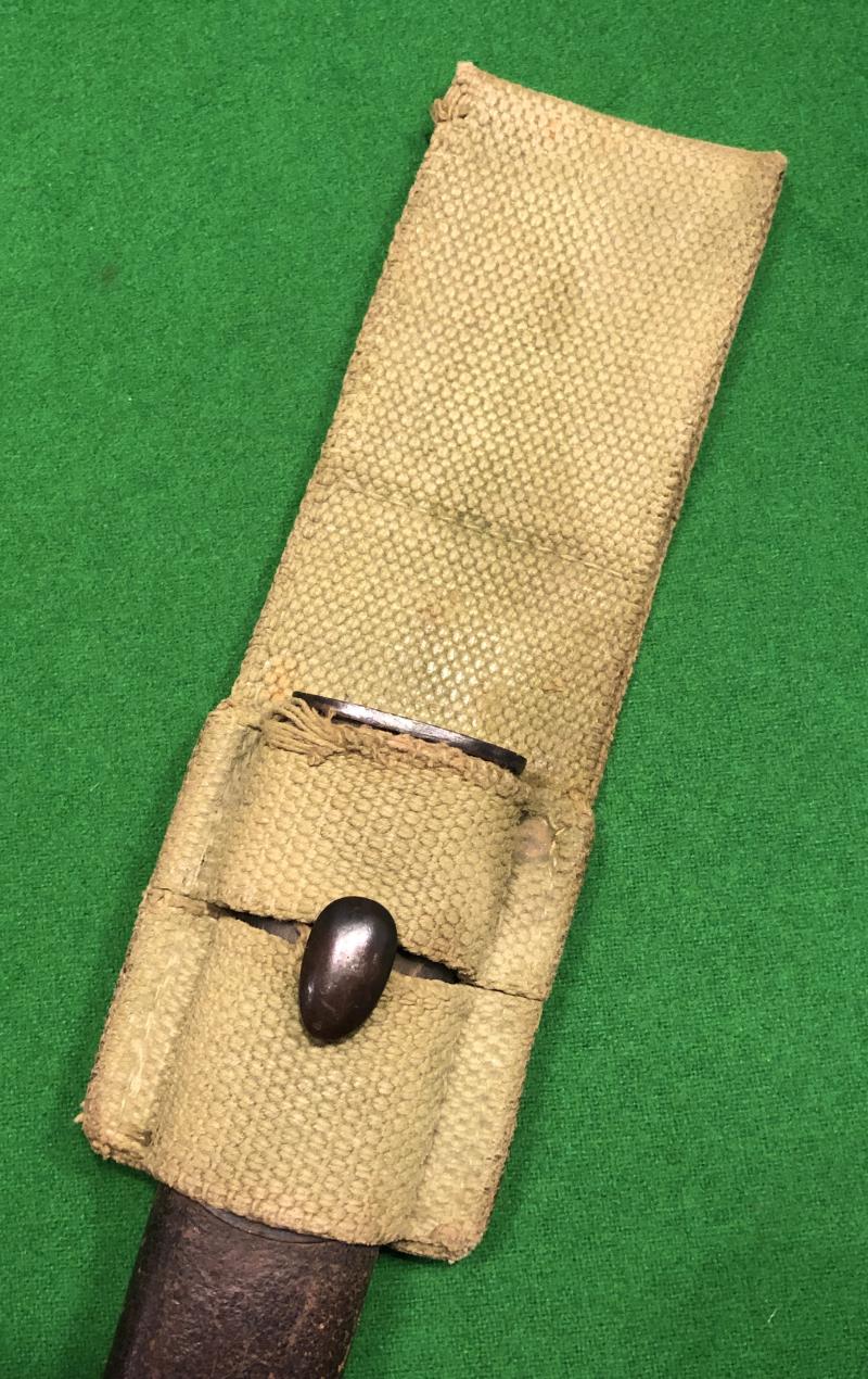 An uncommon pre WW1 British Sword Pattern Bayonet 1907 with quillion removed with issue marks for Alleyn's School London O.T.C. Manufactured by Enfield in September 1910 with numerous clear markings and inspection and reissue marks to ricasso. Minor spotting to the parkerised and sharpened blade. Contained in solid, clean scabbard with inspection marks to reverse and a simplified 1908 Pattern Webbing frog. Above average condition example.