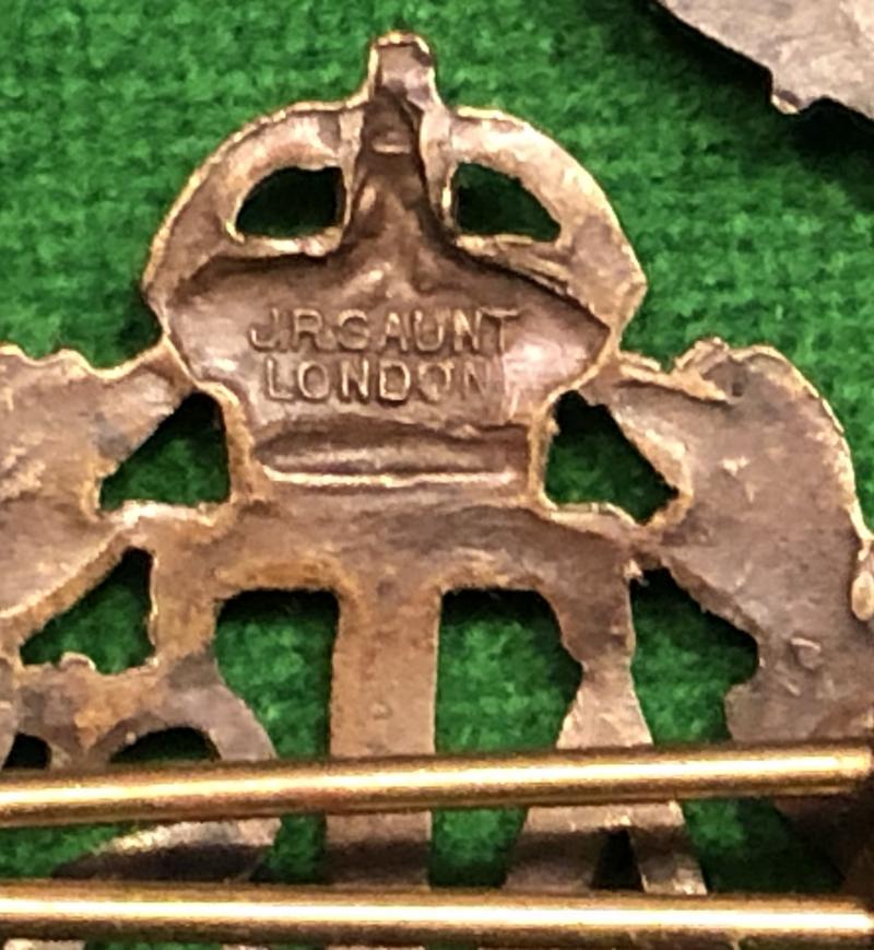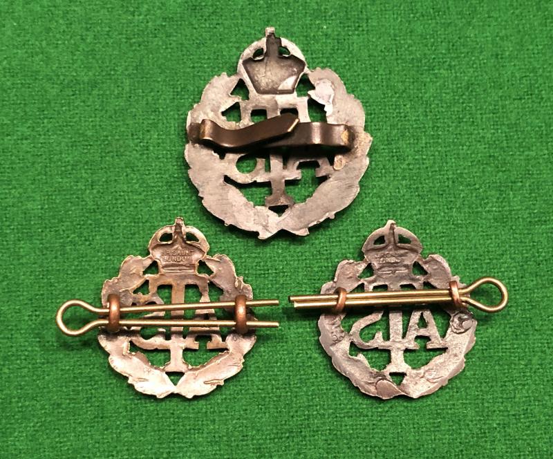 Slightly mis-matched A.T.S. Officer's insignia. Bronzed cap badge with both blades intact accompanied by two bronzed collar badges, both manufacturer marked ' J.R.Gaunt '. Good, clean condition.
