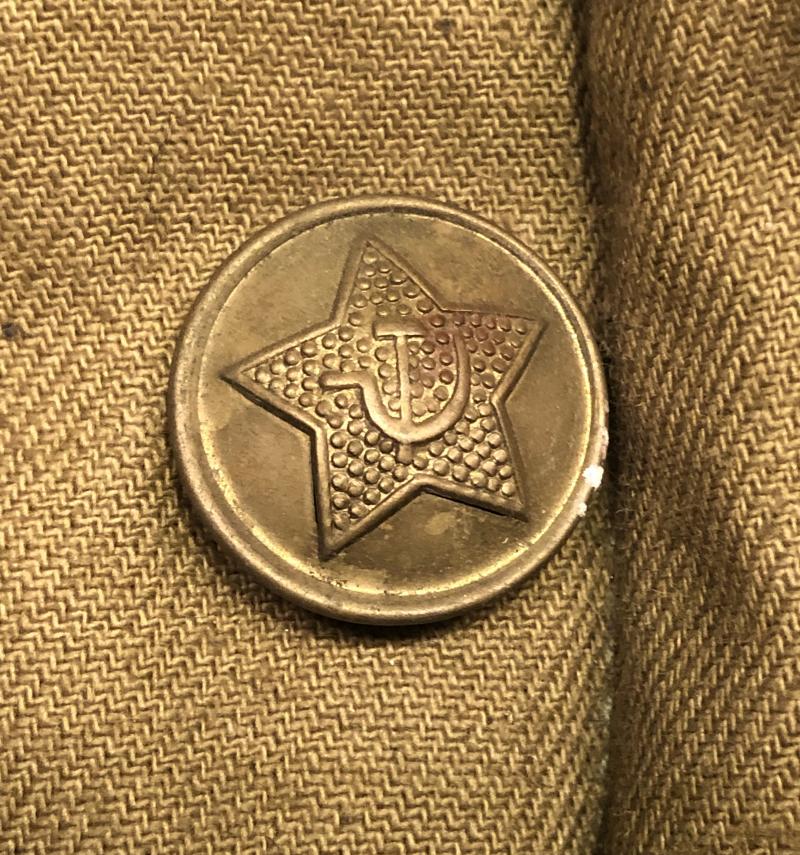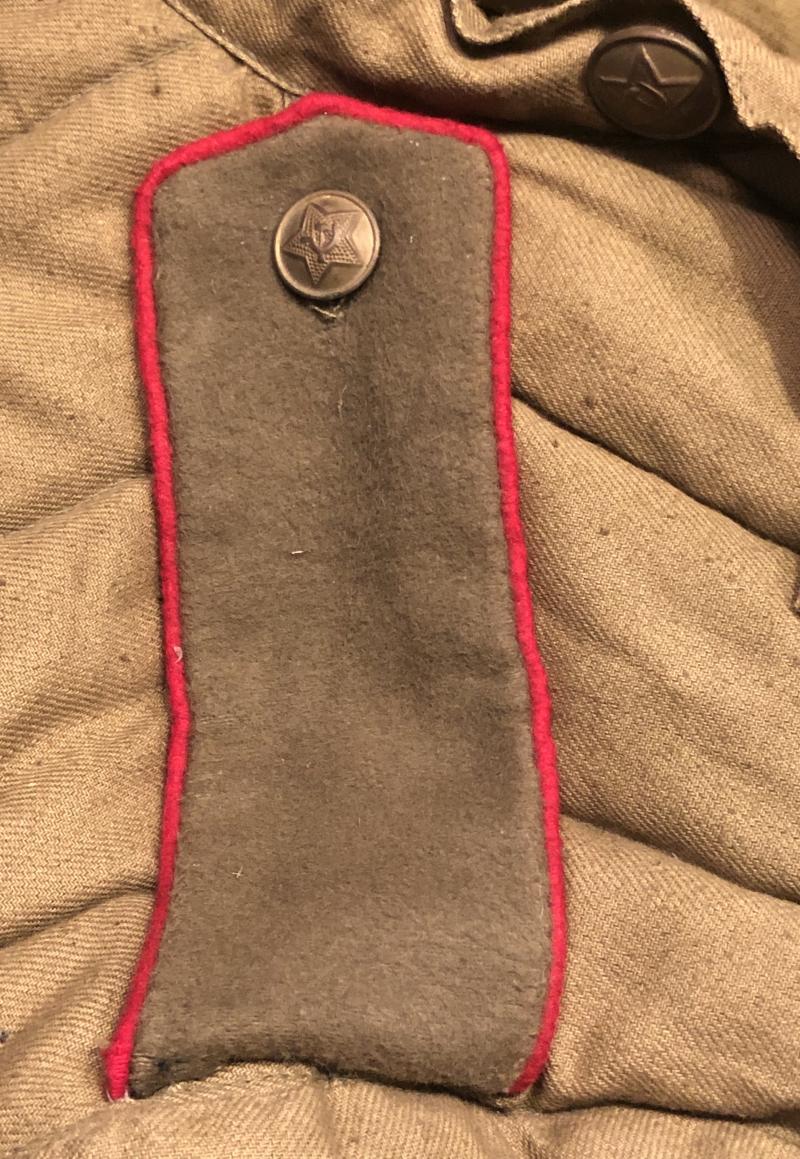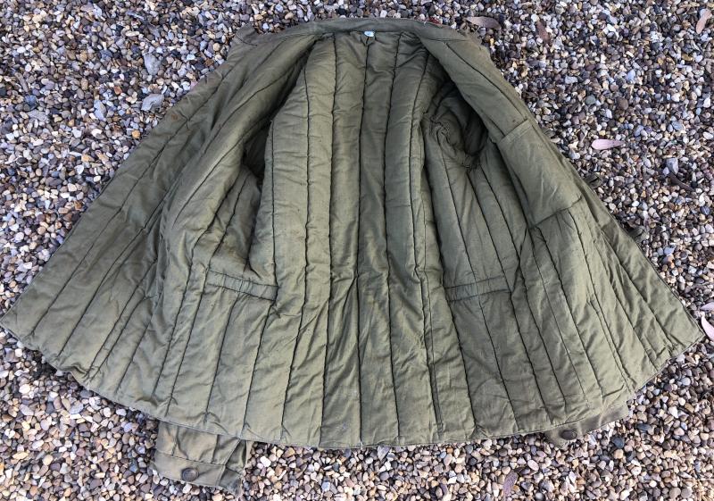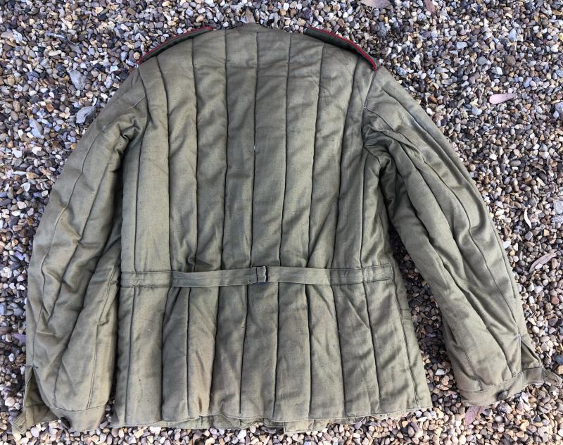 WW2 Russian Tielogreika padded winter jacket. Brass and steel Soviet buttons with sew on shoulder boards with infantry arm of service piping. Both boards have the number ' 3 ' stamped to the reverse. Jacket in excellent, clean, used condition with a size ' 2 ' label stitched to the collar, minor rust to buttons with some minor staining to jacket.