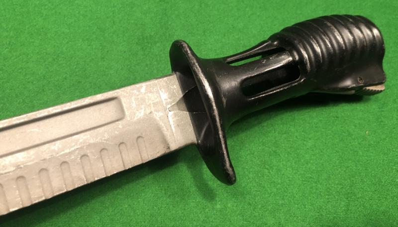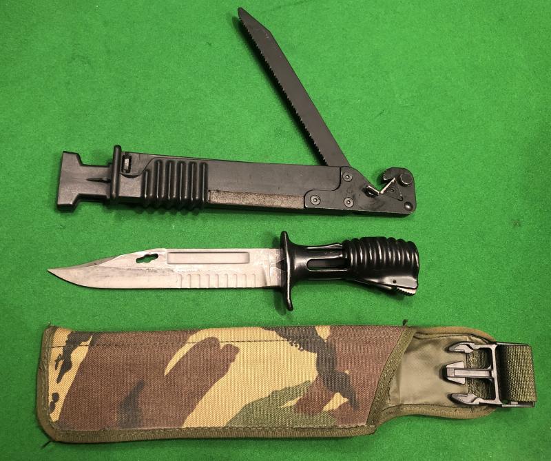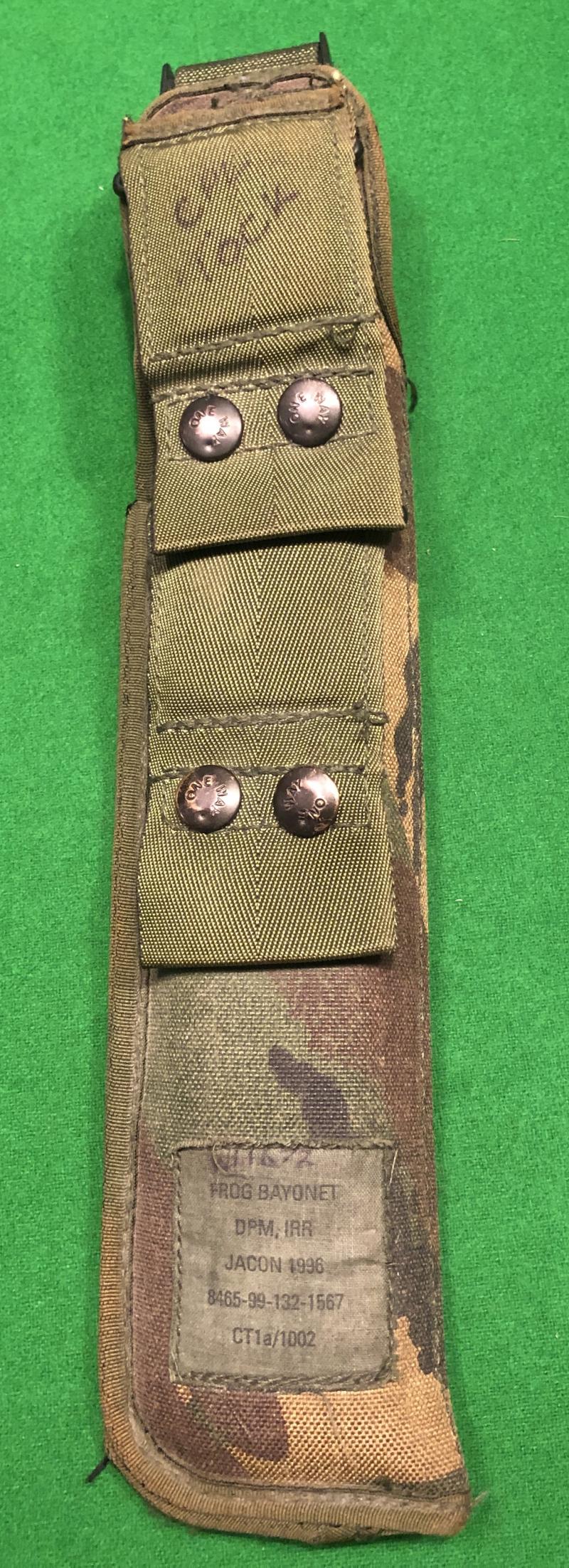 SA80 Bayonet and 1996 dated Infantry scabbard PLCE Nylon bayonet Sheath and comes with black plastic bayonet 'frog' scabbard. Scabbard has saw blade and integral sharpening stone with the ability to attach the bayonet to become wire cutters. Good, used condition with owner's details ' Cpl.Tock ' to reverse of scabbard.