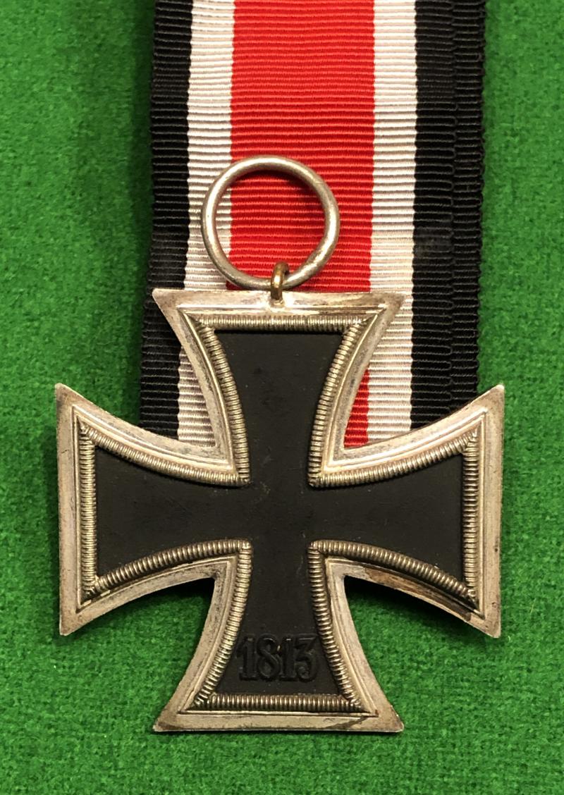 A good example of a Third Reich Iron Cross second class. Three piece construction with unmarked suspension ring accompanied by a length of original ribbon. Good, clean condition with patination to frame.