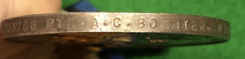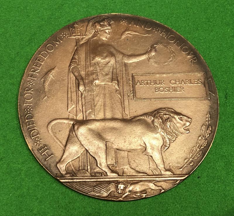 WW1 War and Victory pair, memorial plaque and scroll to TF/203286 Pte.Arthur Charles Boshier of the 4th Battalion Middlesex Regt. Boshier was posted missing on 28/04/1917 during the Arras offensive and his death was assumed for the same date, he is commemorated on the Arras memorial. Grouping appears to have been originally displayed in a frame and has now been dis-mounted and shows small areas of shadowing. Accompanied by a small amount of research but would warrant a further in depth search.