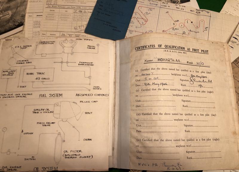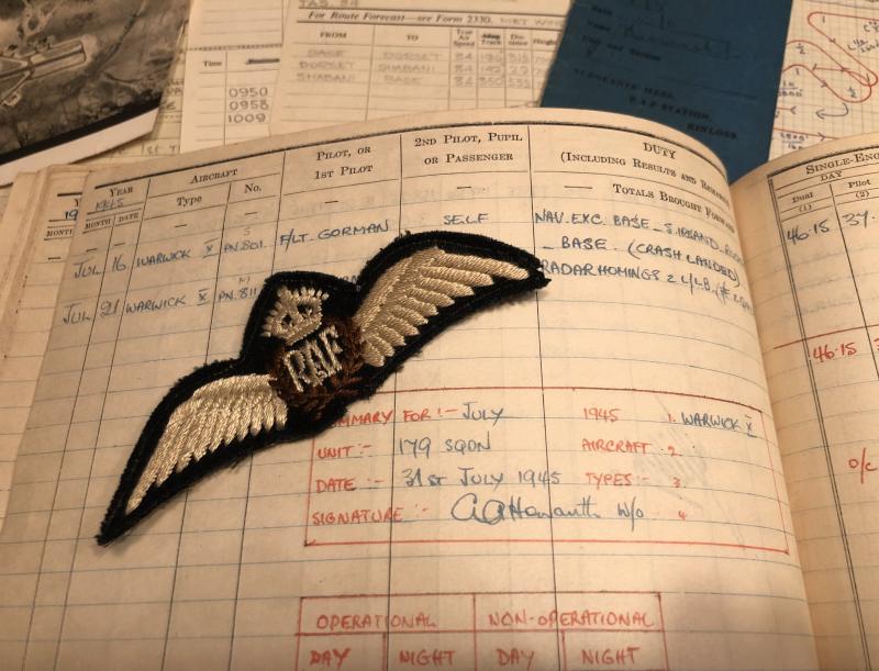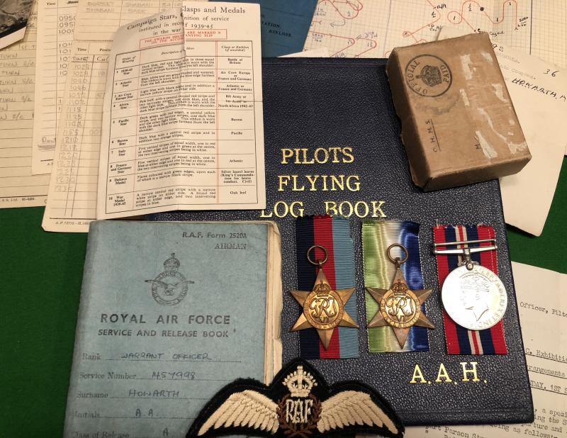 Logbook, medal and ephemera grouping to 1457998 W/O.Arthur Howarth a pilot with 179 Sqn. Coastal Command. Howarth originally an employee of Bristol Aircraft, started flight training in Oct.1942 in Rhodesia being awarded his wings in March 1943. Passing through 6(P)AFU AND 6 OTU and converting to multi-engine types before joining 179 Sqn. on Wellingtons. Operating from Predannack, Chivenor and Benbecula Howarth acting as second pilot, undertook Box patrols and convoy escorts. December 1944 saw the squadron convert Warwick Vs where patrols over the S.W.Approaches continued. He ended his war with a crash landing and a series of Leigh Light sorties with submarines.