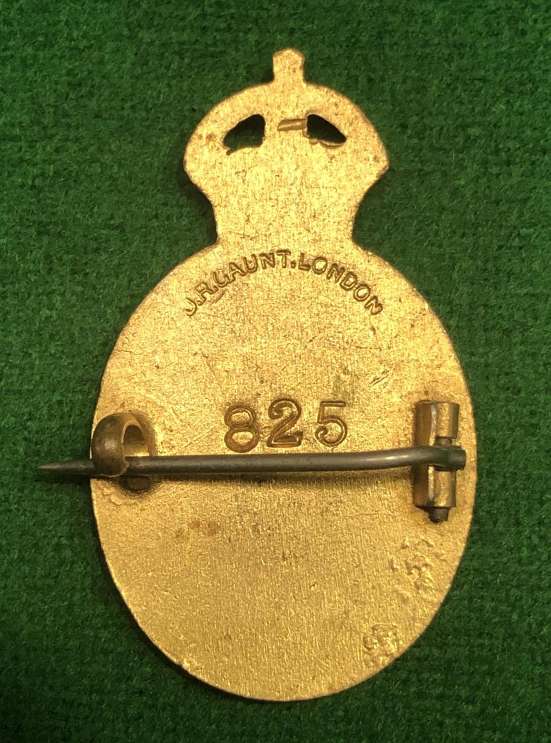 A pleasing example of a WW1 period Voluntary Aid Detachment Bucks nurses' pin back badge. Crowned gilt oval example bearing a white swan to a half black half red enamel centre, within blue enamel title surround, the reverse with maker's details 'J.R.Gaunt London' and official low issue number ' 825 '. Excellent condition with bright gilt and enamel with a small enamel flaw at approx 3 o'clock position.