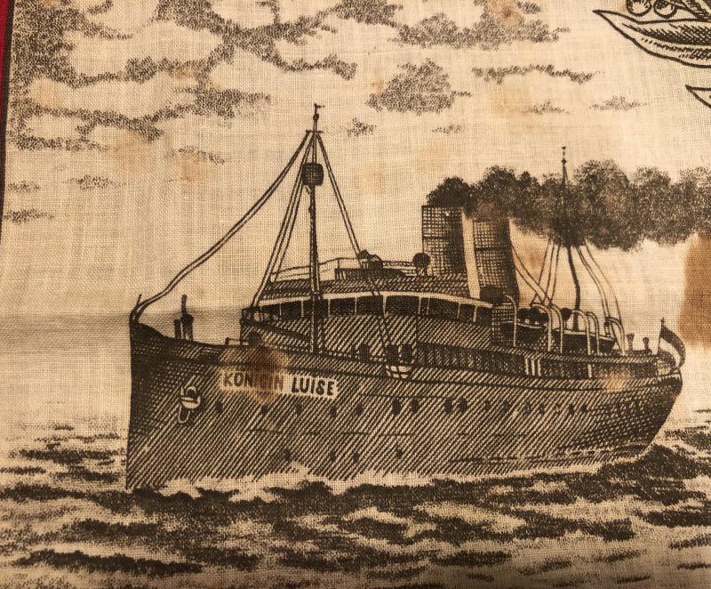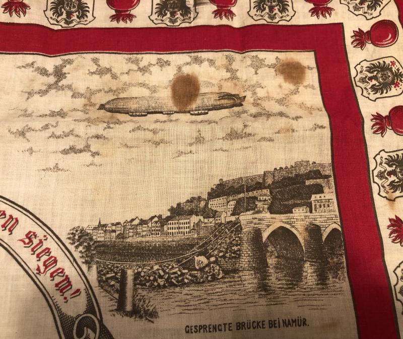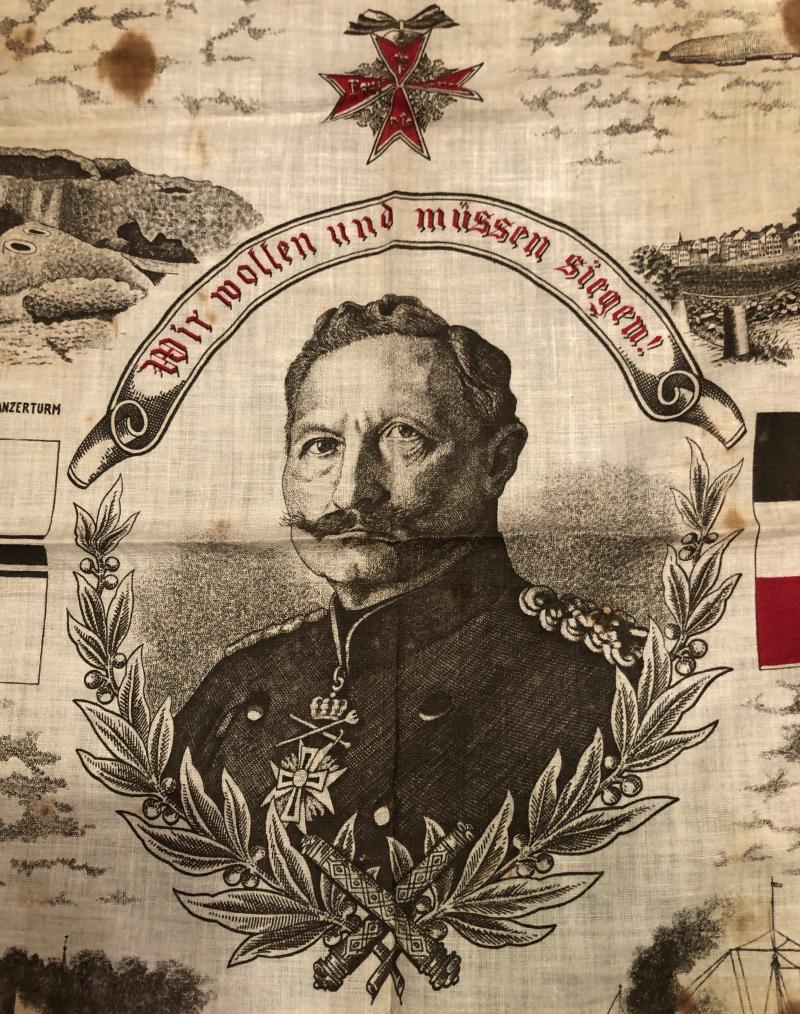 Printed cotton scarf 64cms x 60cms featuring Imperial patriotic WW1 themes. Entitled ' We will and must fight ' with an image of the Kaiser surrounded by awards and images of early successes achieved by imperial forces. Good overall condition with some staining.