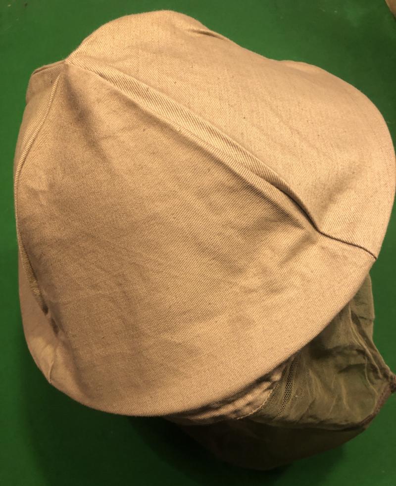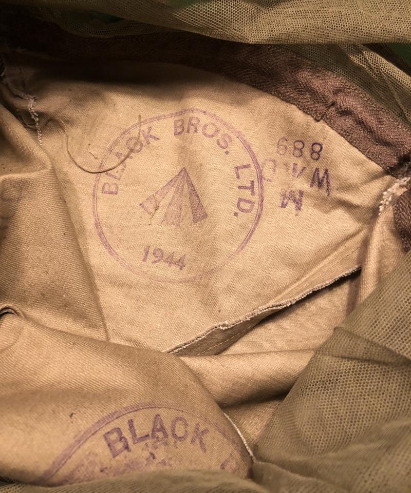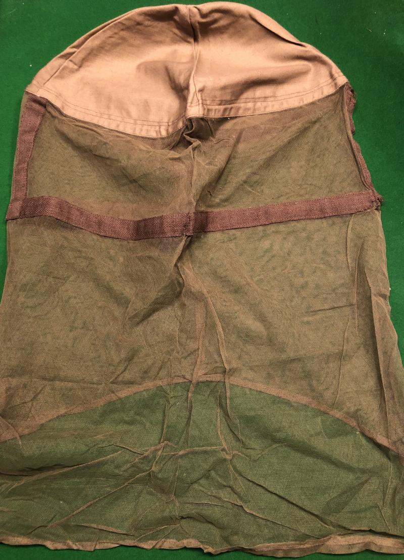 1944 dated British mosquito net designed to be helmet mounted. Cotton helmet cover with drawstring with mosquito net attached which has cotton reinforcements designed to give a clear vision area. In excellent, probably unissued condition, with clear manufacturer and date markings. Minor damage to one area of cotton reinforcement.