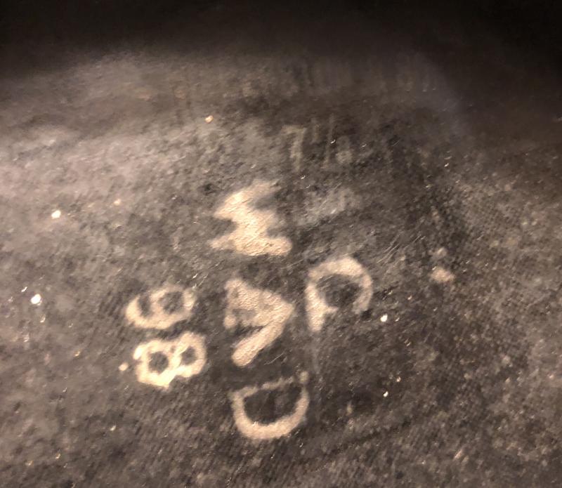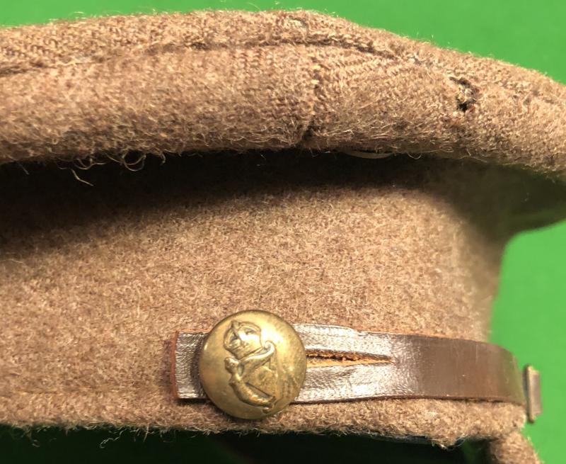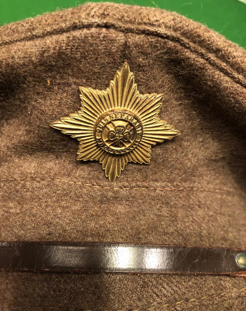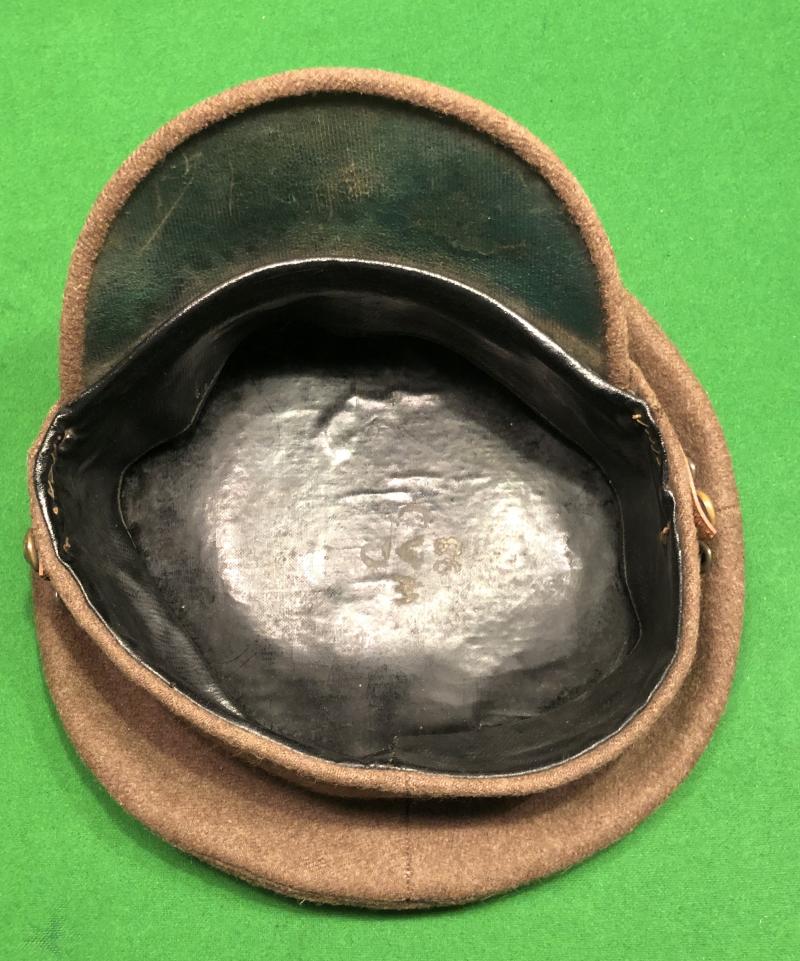 1940 dated SD cap by Silberston & Sons worn by a member of the Irish Guards. Size 7 1/8 with gilded Irish cap badge and Irish Guards button supporting the leather chin strap. Wool body with an oil cloth headband and lining. Faint but legible manufacturer's details and clear inspection marks. Good used condition with some minor moth grazing and some minor holing.