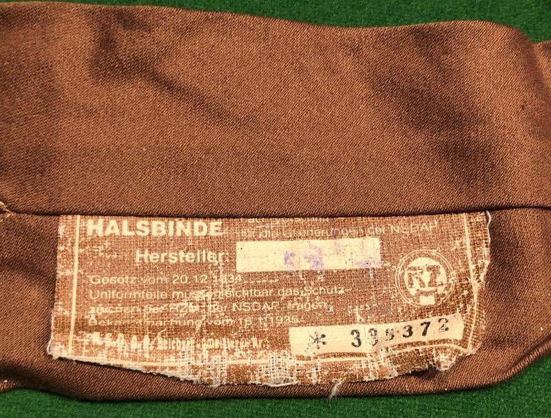 Official issue N.S.D.A.P. ' Halsbinde ' or necktie complete with RZM label. Good, slightly crumpled condition with no damage with minor loss of finish to label.