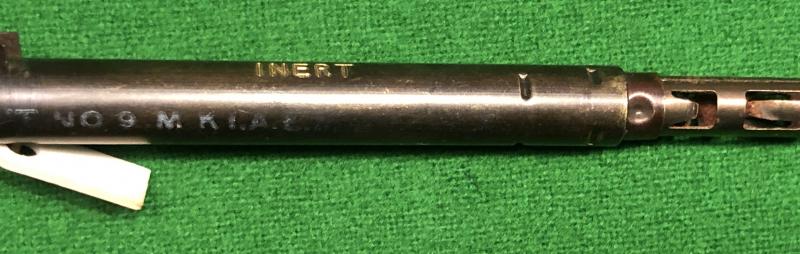 An excellent example of a British Switch No.9,Mk.I ' L Delay '. This particular example produced a 6 hour delay. Developed by Millis Jefferis of MD1 the L Delay instead of relying on the chemical action of a corrosive liquid on metal (which was subject to temperature variation), it used a piece of metal under stress - the metal in question being a lead alloy that was extremely affected by mechanical creep. A piece of this lead was notched to a set diameter, the diameter setting the time delay. When the starting pin was removed, this wire was placed under tension by the spring-loaded striker, and began to gradually stretch. After certain time it would snap at the notch and allow the striker to hit the percussion cap. Generally speaking L-delays were slightly less reliablecitation needed and had shorter delays, but were more reliable underwater (if a No. 10 fuze developed a leak, water would dilute the corrosive liquid and increase the delay or stop the fuze from working). This example in excellent condition with remains of designations and batch numbers stencilled to body and engraved ' INERT ', complete with rubber snout shroud.