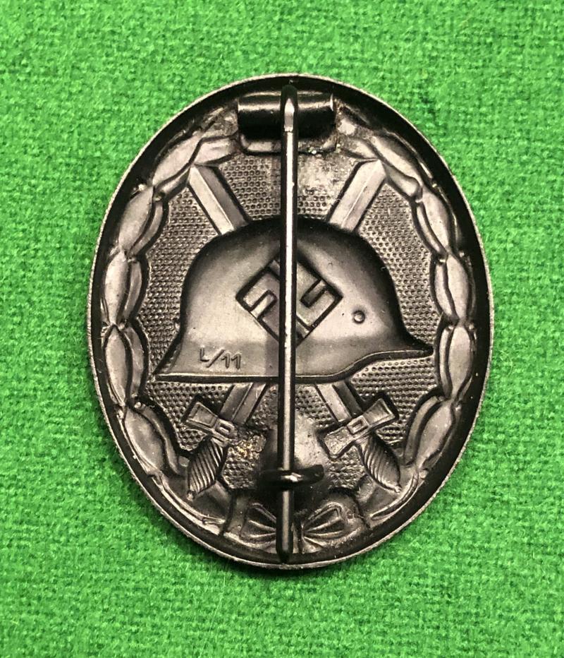 WW2 1939 Wound Award in black. Die stamped steel example with needle pin in excellent, unissued condition in original tissue. Manufacturer marked L/11 indicating manufacture by Wilhelm Deumer of Lüdenscheid.