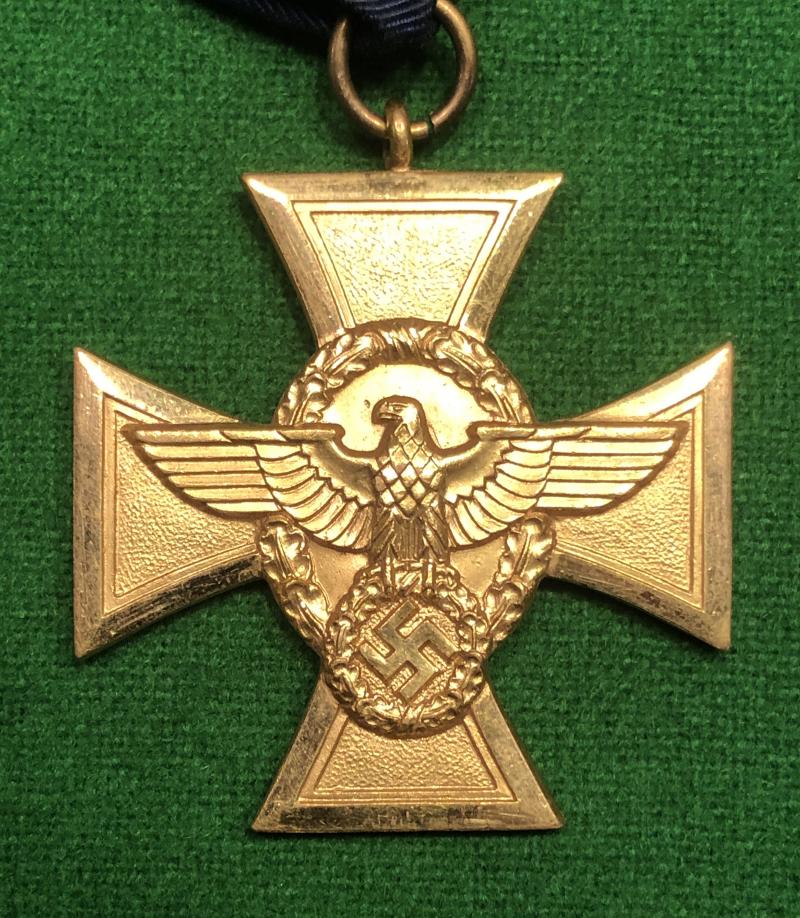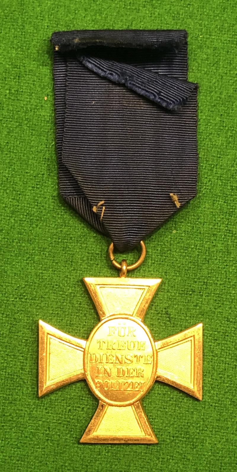 A good example of a German Police 25 year Long Service Medal. Gilt cross suspended on a watered silk ribbon with Police emblem embroidered to centre. Good, overall condition with some minor wear to surface gilding.