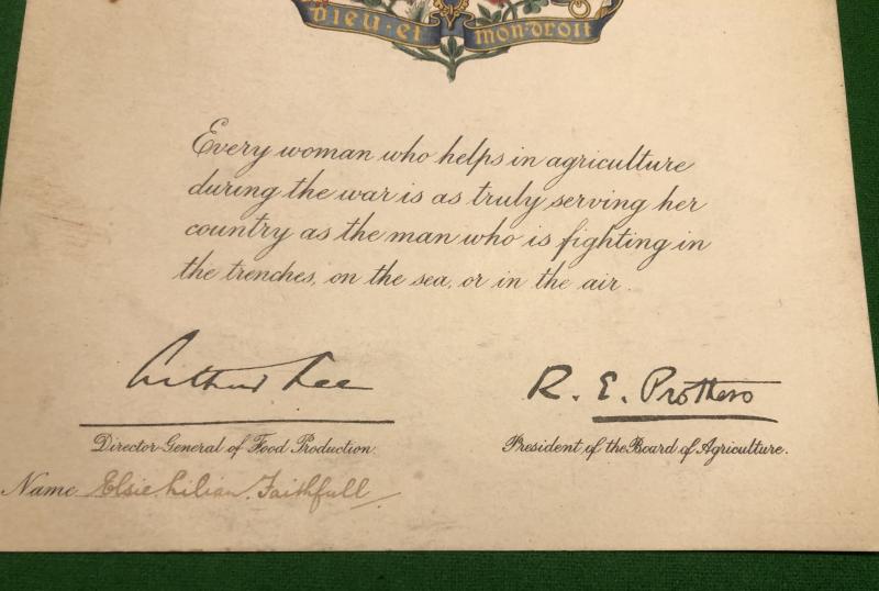 Printed card certificate given for service in agriculture during WW1 undertaken by women. Primarily given for service in the first incarnation of the Land Army but was also given to women involved with other areas of agriculture. This example issued to Elsie Lilian Faithfull. Good, clean condition with light marking.