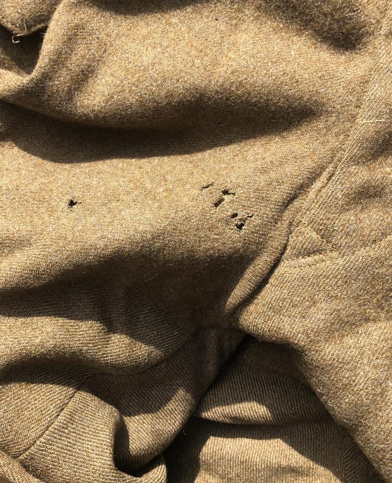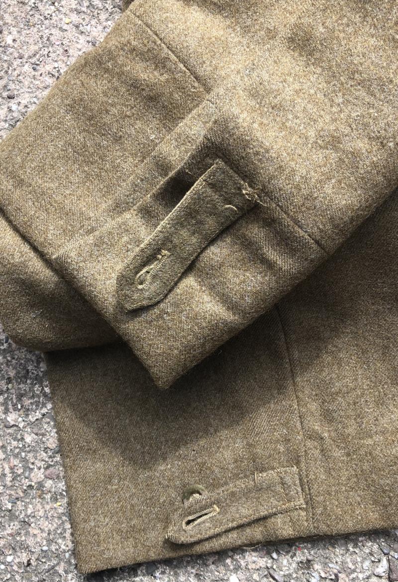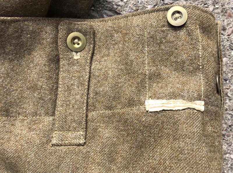 A particularly large ( probably size 17/18 ) pair of unaltered '37 Patt Battledress Trousers. Approx waist 37/38" with ankle adjustments and all buttons present unfortunately label now missing with some remnants still present, no interior inspection stamp. Excellent, clean condition with various minor moth holes with most congregated in one area of the crotch. Priced realistically to reflect the moth damage and lack of label.