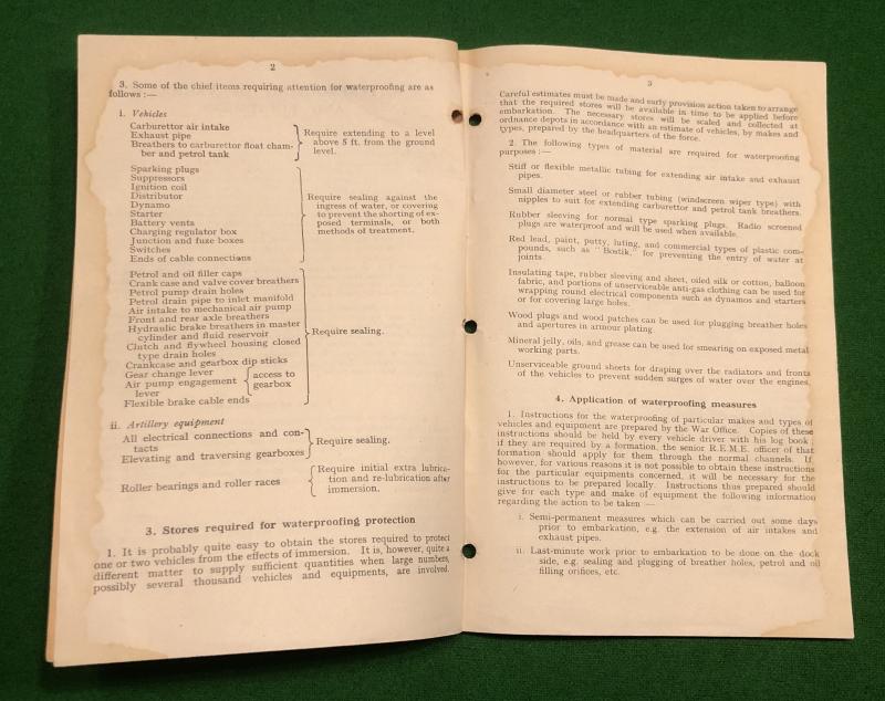 Combined Operations Pamphlet No.41C ' R.E.M.E. Waterproofing of Vehicles & Equipment ' 1942. 6pgs covering all subjects from application of waterproofing measures to beach recovery. In generally good condition but ironically has some damp stains to the page edges.
